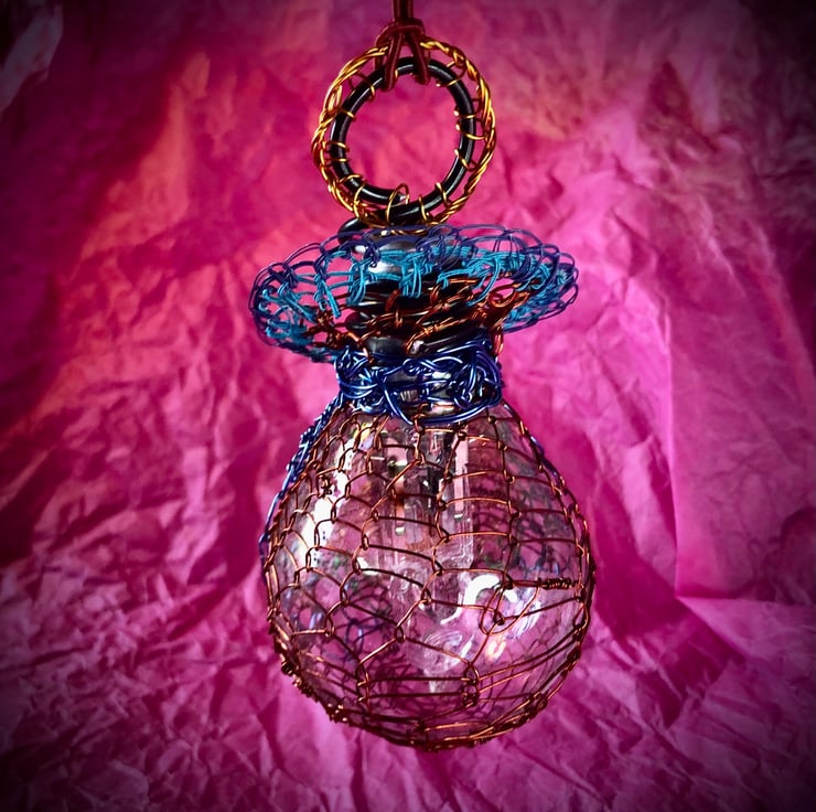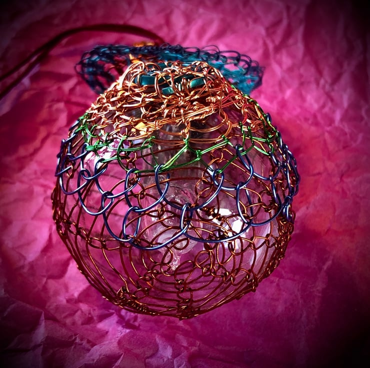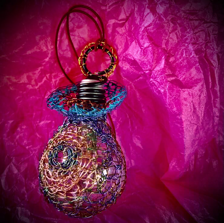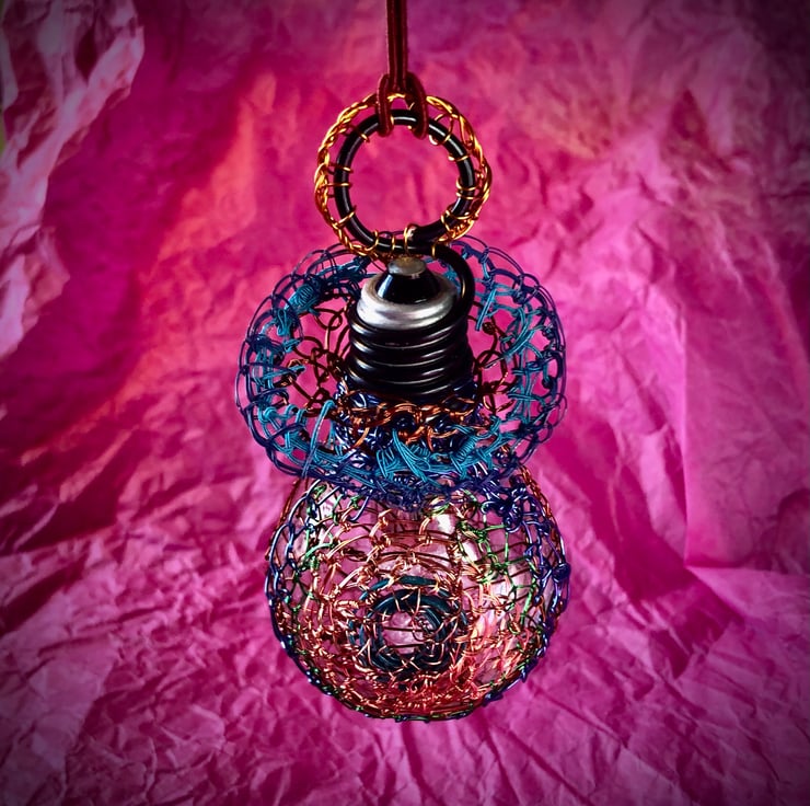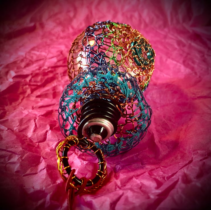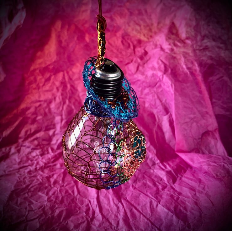 Christmas Lightbulb bauble - handmade with recycled materials - combining new and repurposed wire - fine lacquered or textile bound copper wire, recycled television wire and floristry wire, repurposed wrapper, recycled spent lightbulb and repurposed terracotta coloured braid.