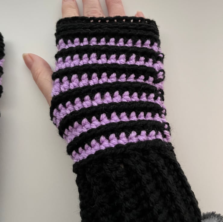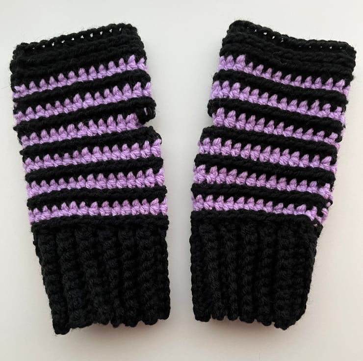 Crocheted in acrylic yarn, standard adult size and plenty of stretch. Purple and black.