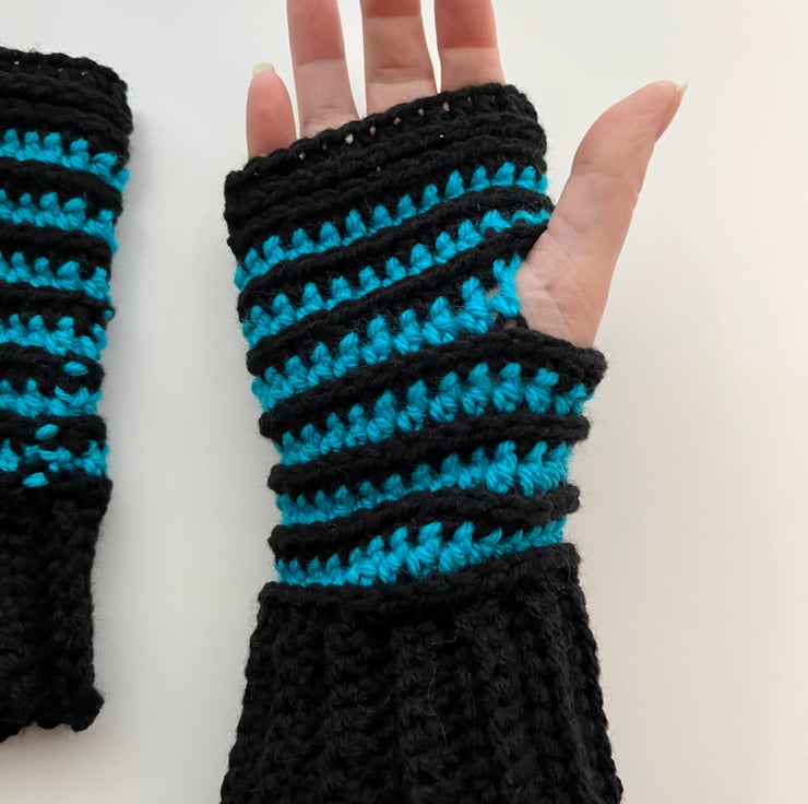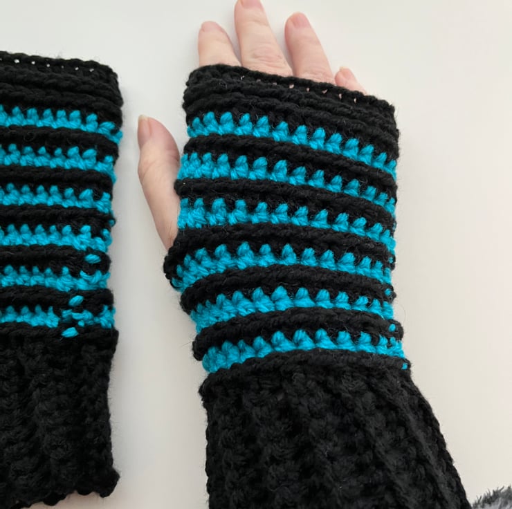 Crocheted in acrylic yarn, adult size with plenty of stretch, in turquoise and black