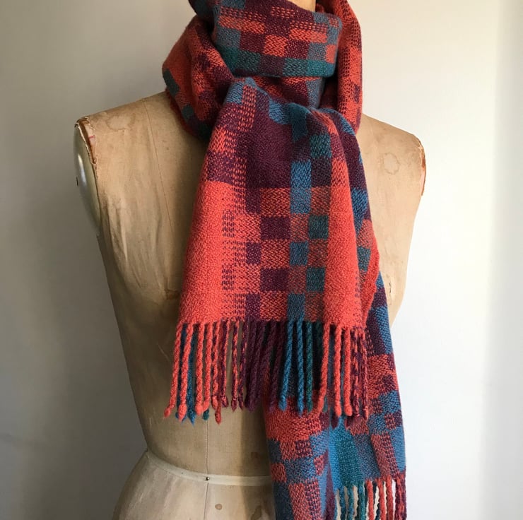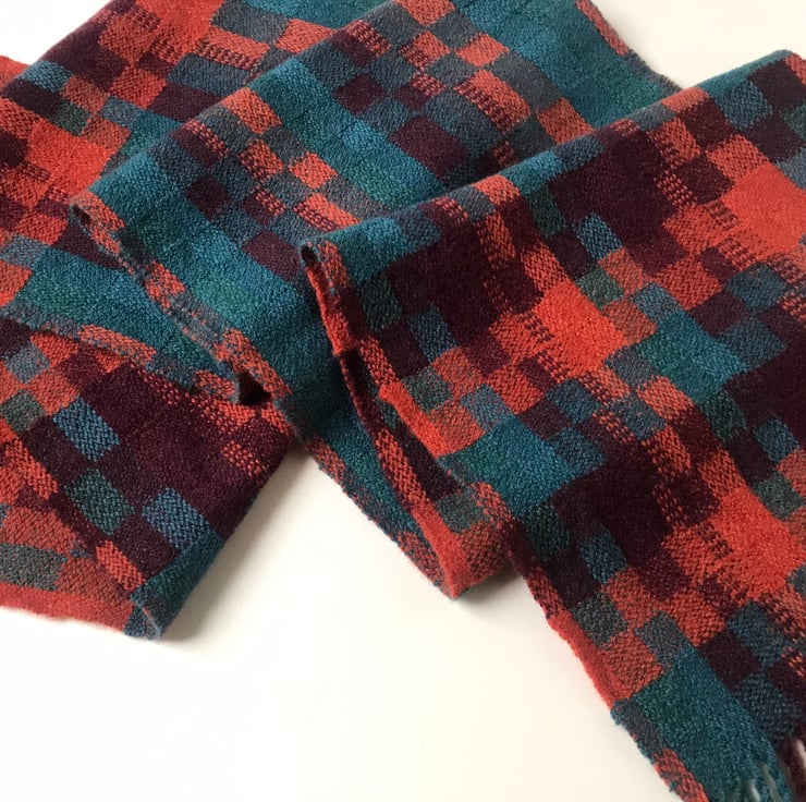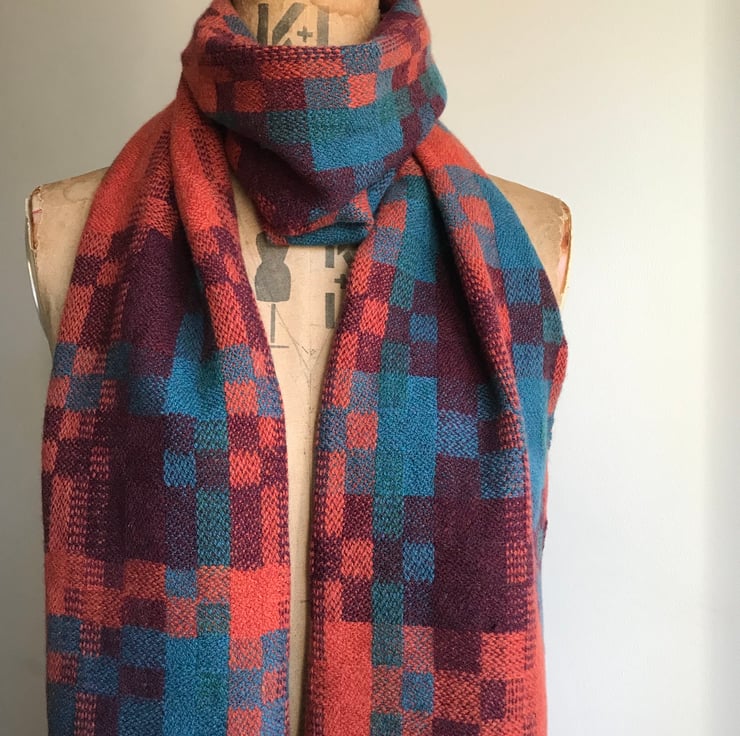A luxuriously soft scarf designed and handwoven in my North Yorkshire studio. The unique colour combination and contemporary woven pattern create a beautiful scarf.