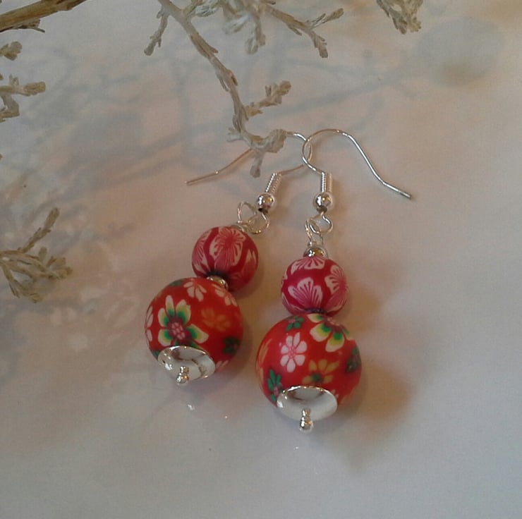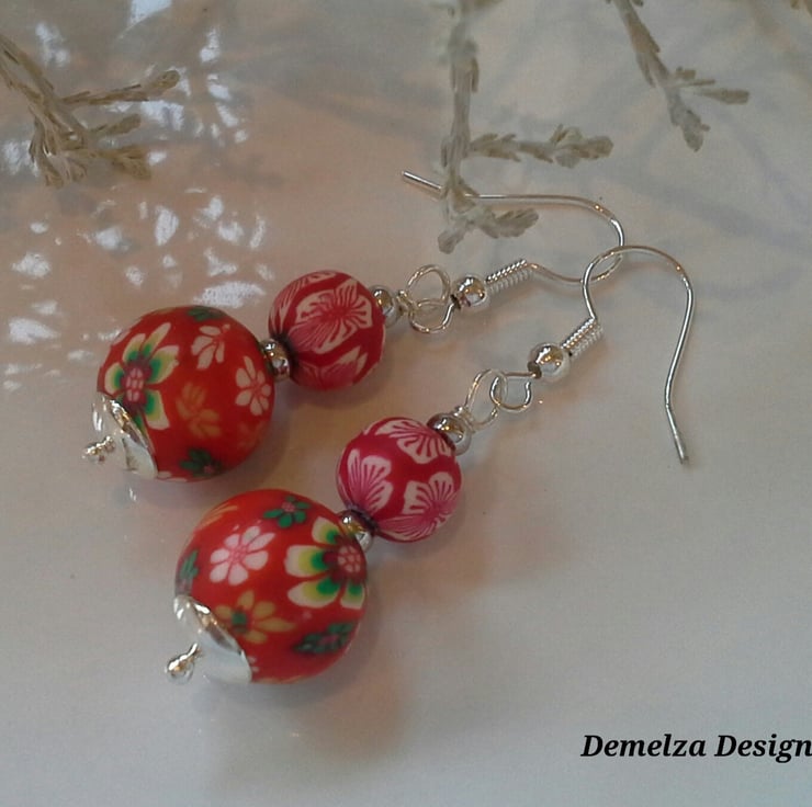 A very pretty eye catching pair of earrings designed and hand crafted using hand made polymer play 12mm and 4mm beads. All components used are quality silver plated. They are extremely light weight, therefore will not drag down on the ear lobes.
