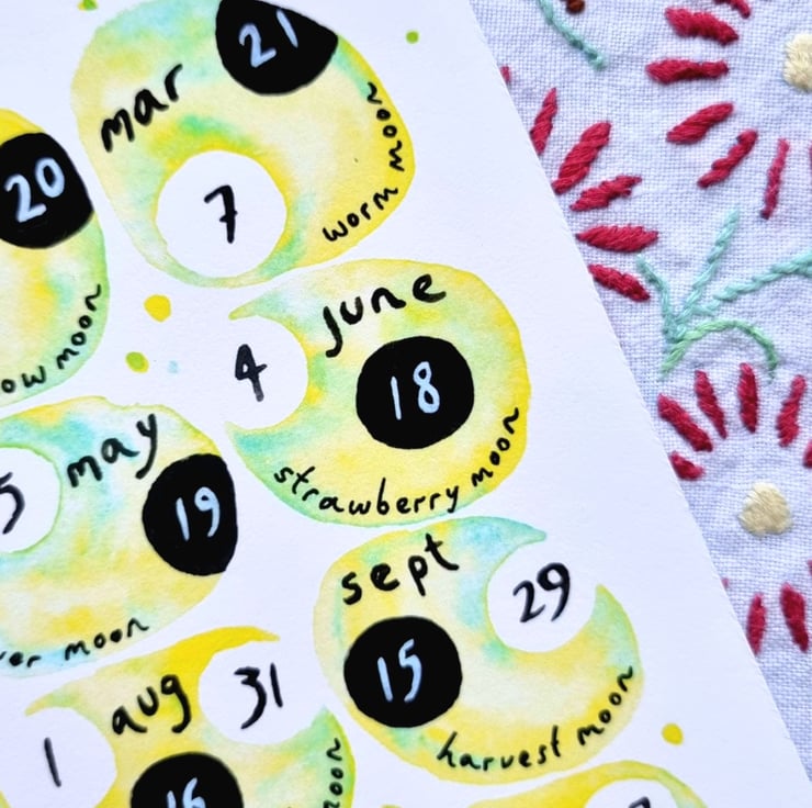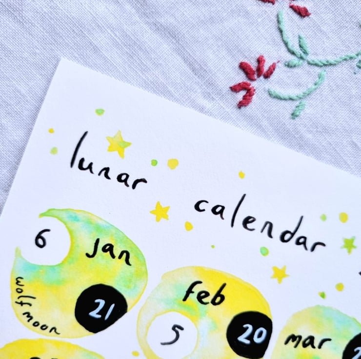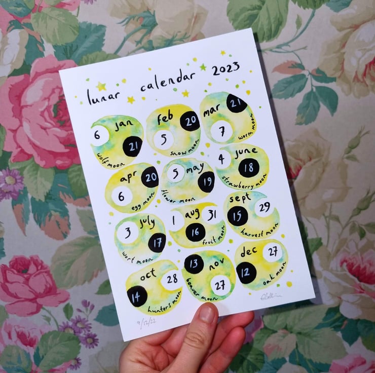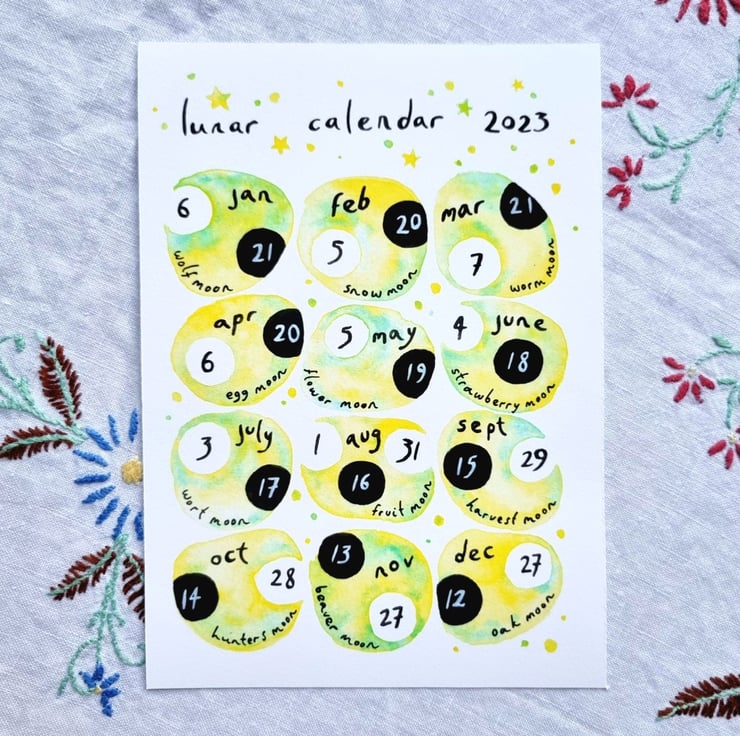 A5 lunar calendar for 2023 in lemon yellow, a print of my watercolour design on high quality, textured card.