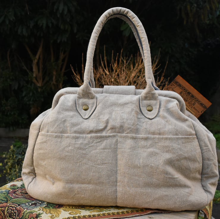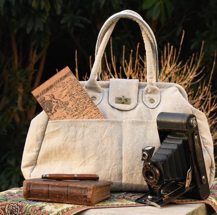 Mary Poppins Victorian style Gladstone bag made from natural linen and eco friendly materials.