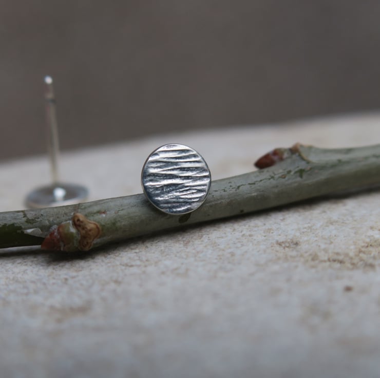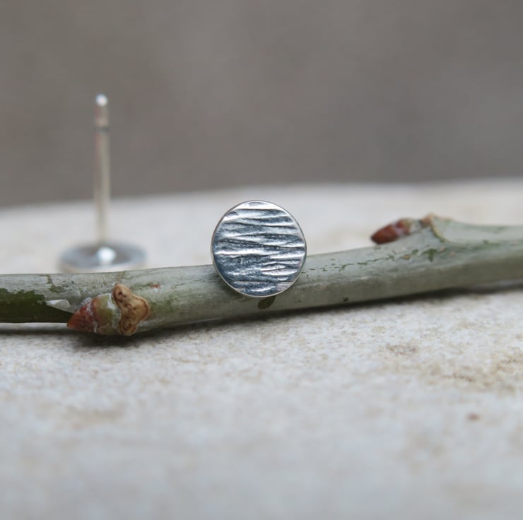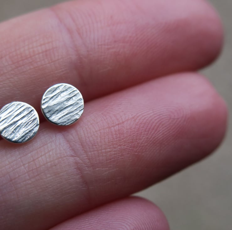 To create these silver studs we cut silver sheet into discs. Then we hammered them and soldered sterling silver posts to the back.