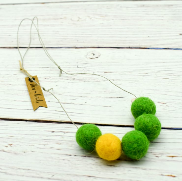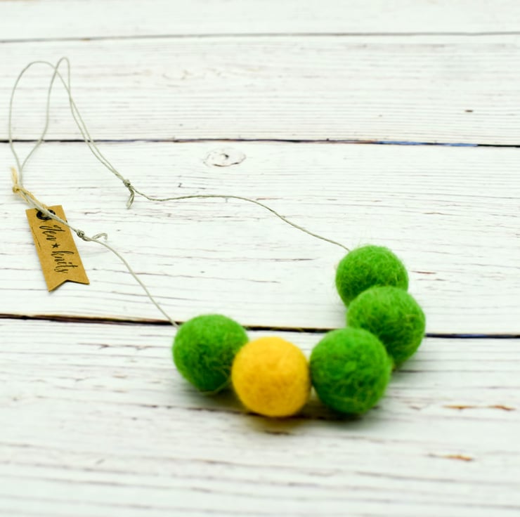 This statement necklace has been created using five felted beads made from green and yellow wool and strung on light grey 0.5mm hemp cord.