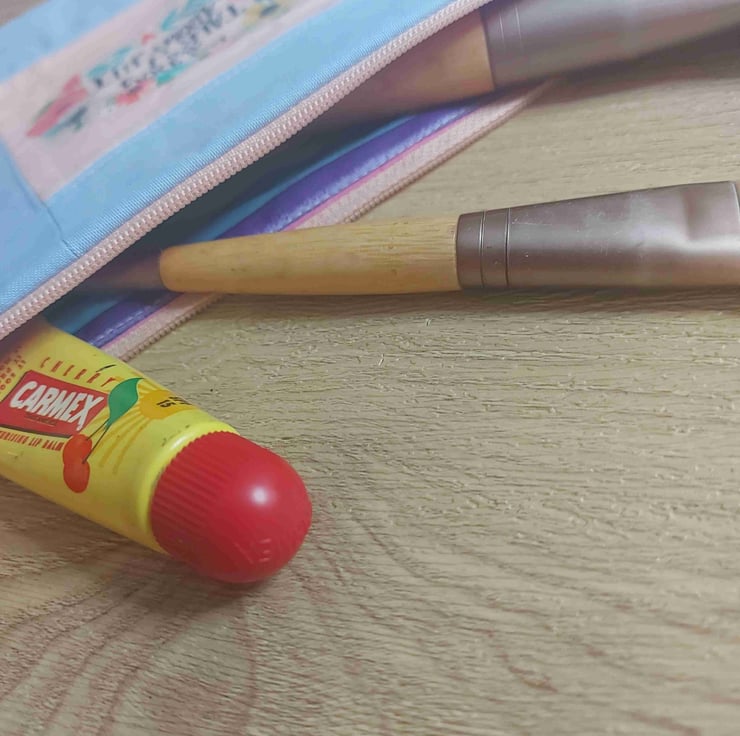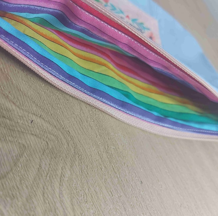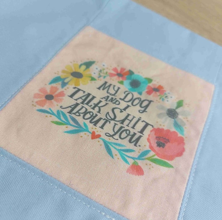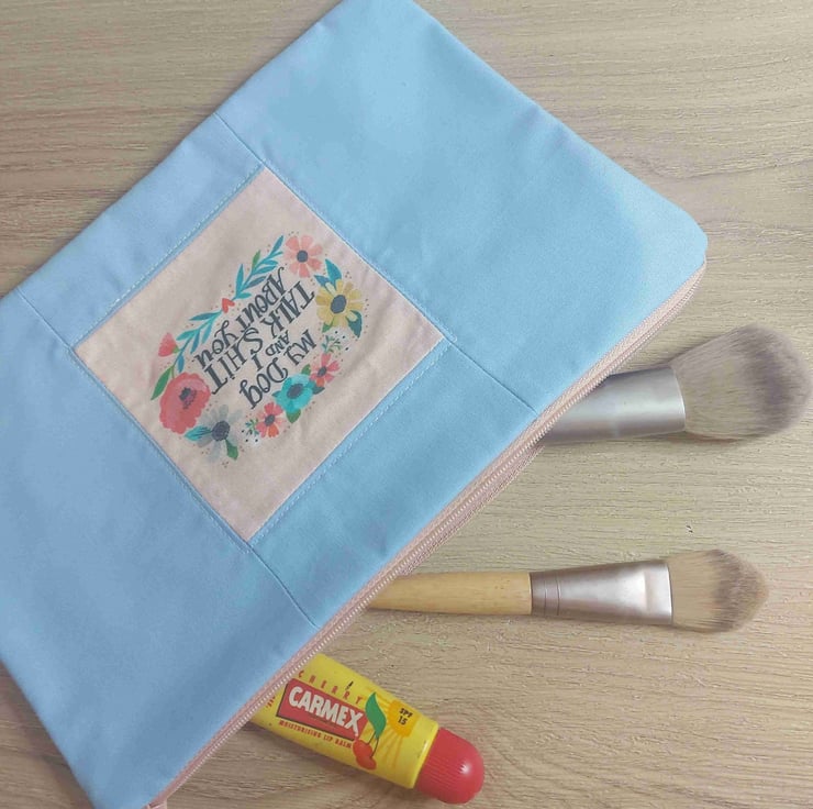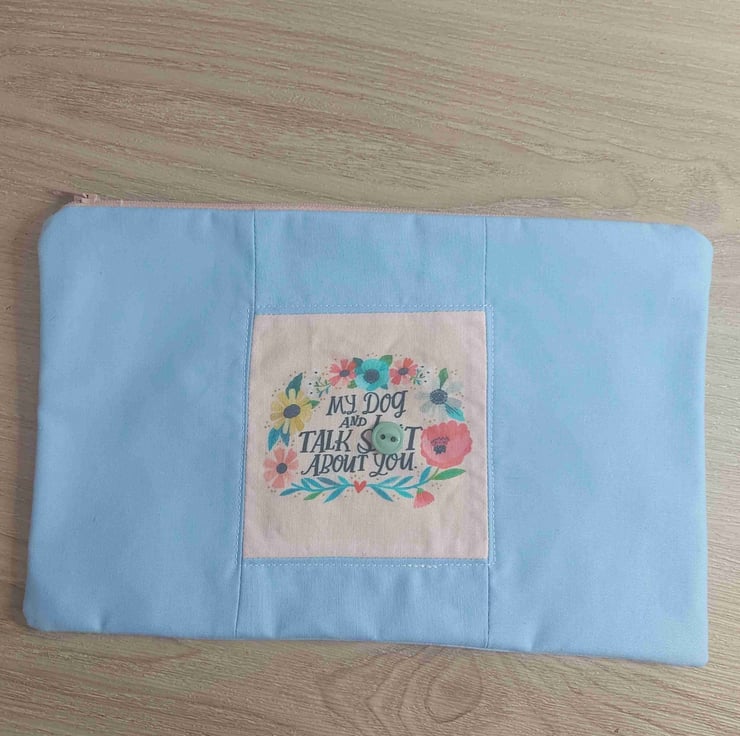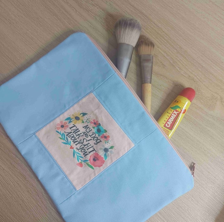 This is a hand made one of a kind make up bag or pencil case users choice , in a beautiful pale blue cotton . The lining is a rainbo print . The real feature of this range is the panel on the centre front of the bag this one reads '' My dog and i talk sh-t about you '' surrounded by wild flowers . This hole collection is a little bit cheeky but all beautifully don there are no repeats in this collection so every bag is a one off they are all also roughly 10 by 6 inches with a 9 inch zip .