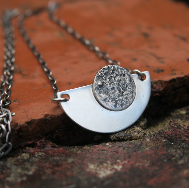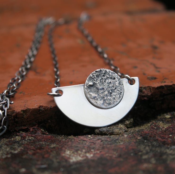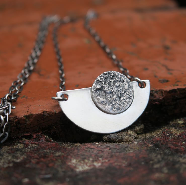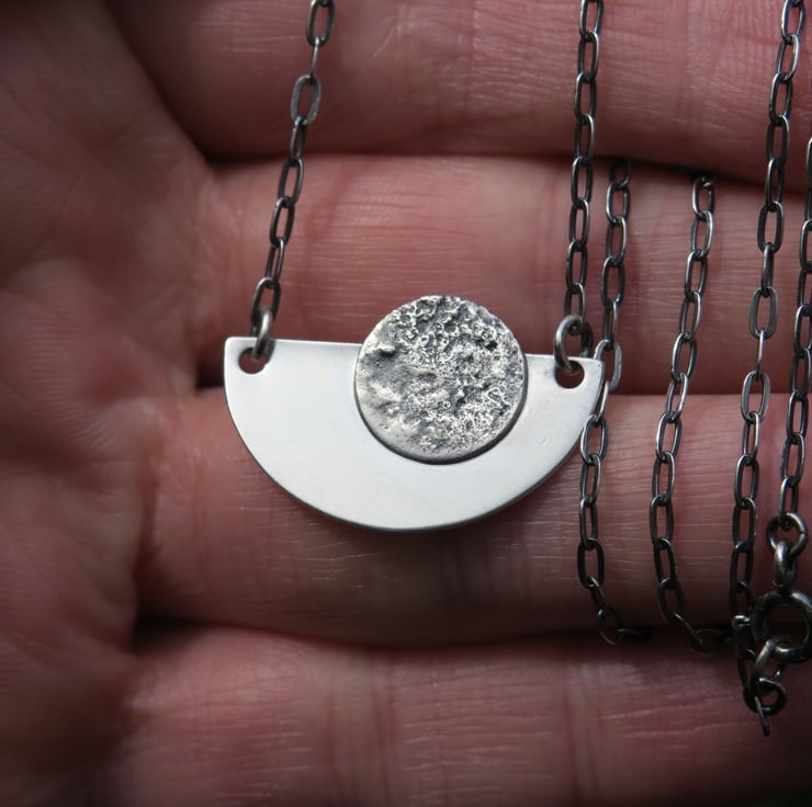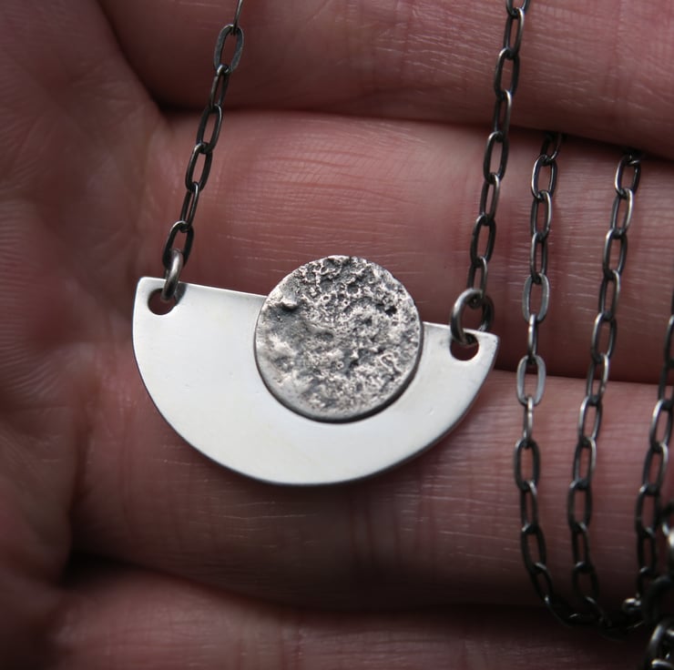 Contemporary full moon necklace hand made of solid sterling silver. Oxidized to enhance design details.