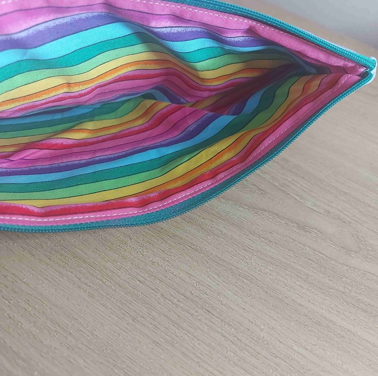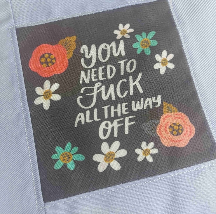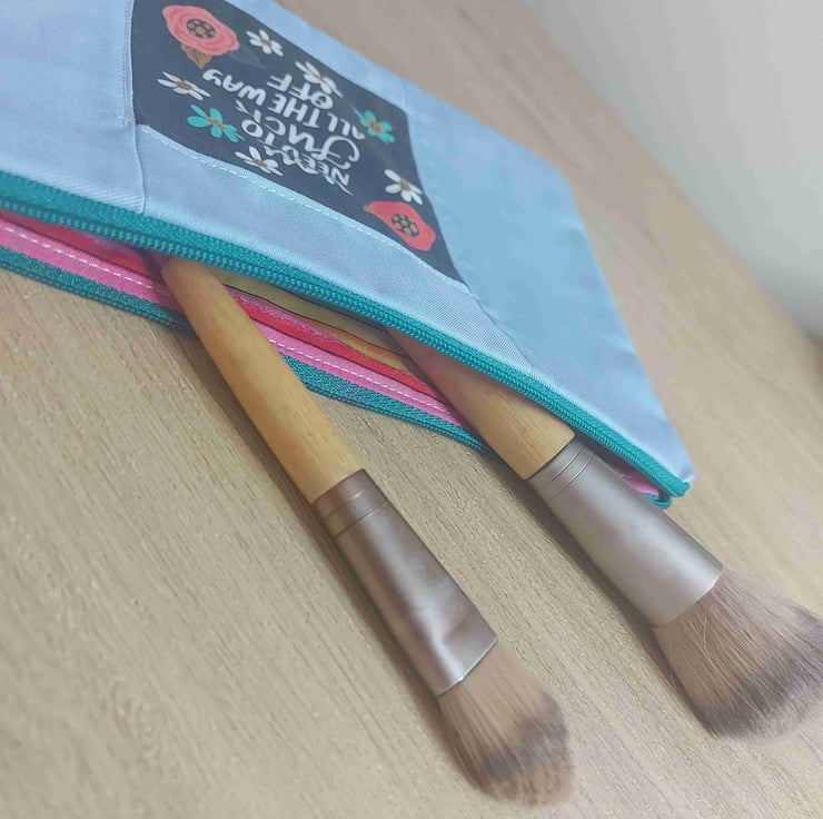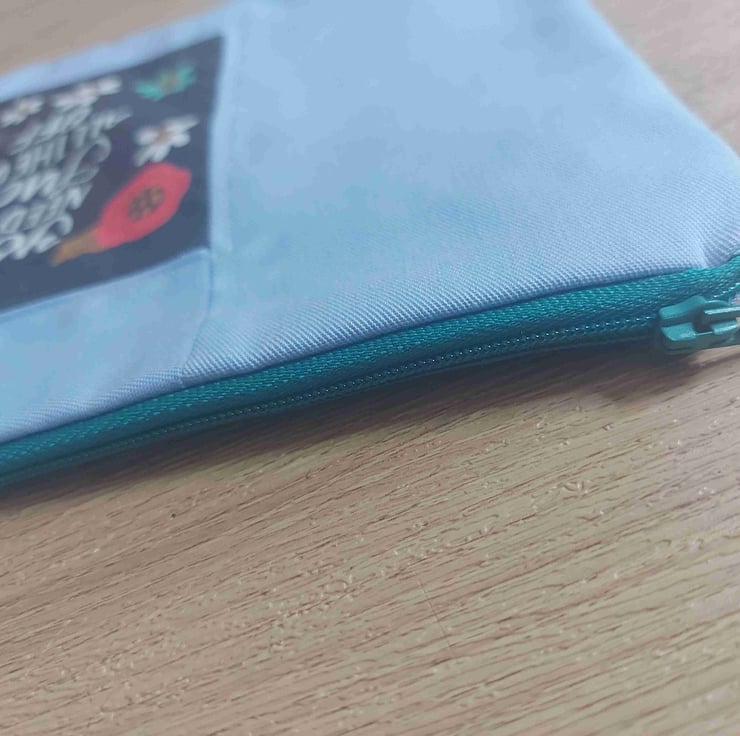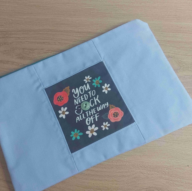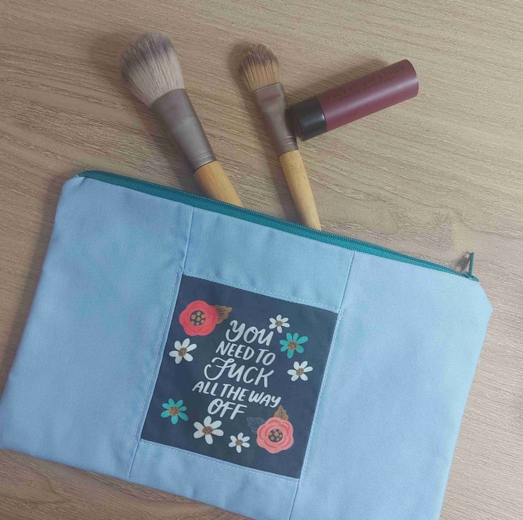 This is a hand made one of a kind make up bag or pencil case users choice , in a beautiful pale blue cotton . The lining is a rainbo print . The real feature of this range is the panel on the centre front of the bag this one reads '' you need to fuck all the way off '' surrounded by wild flowers . This hole collection is a little bit cheeky but all beautifully don there are no repeats in this collection so every bag is a one off they are all also roughly 10 by 6 inches with a 9 inch zip .