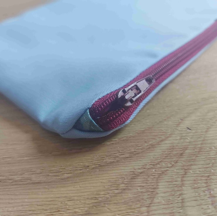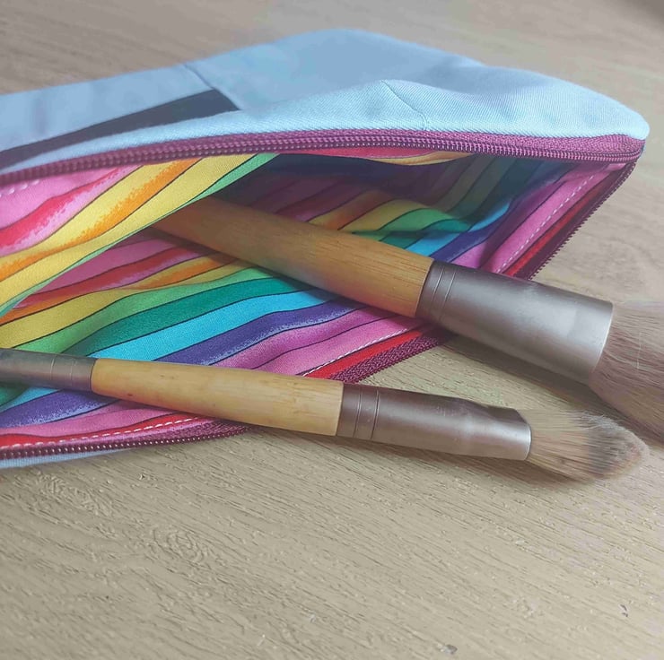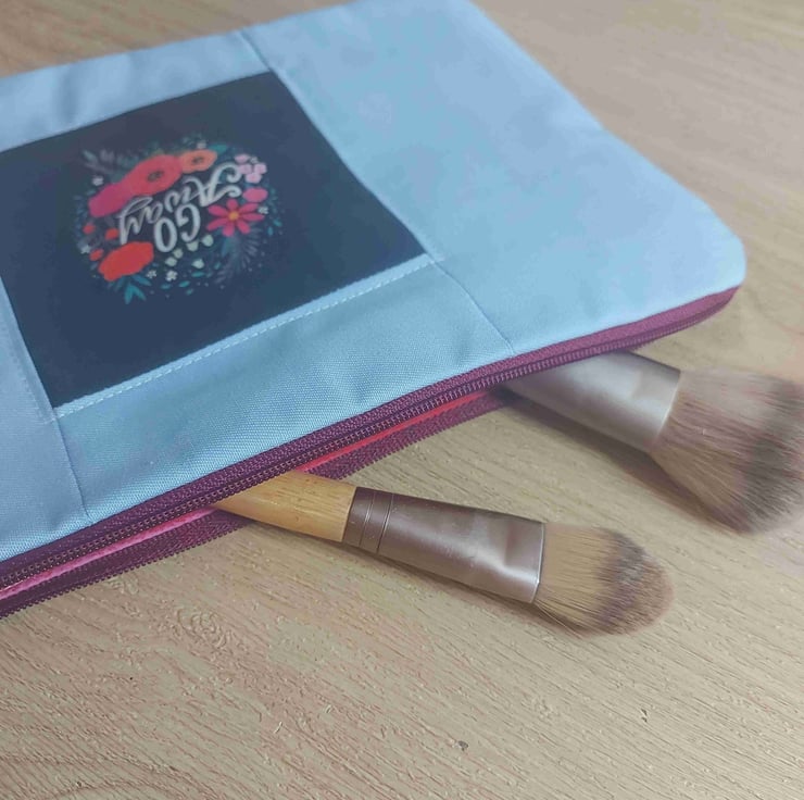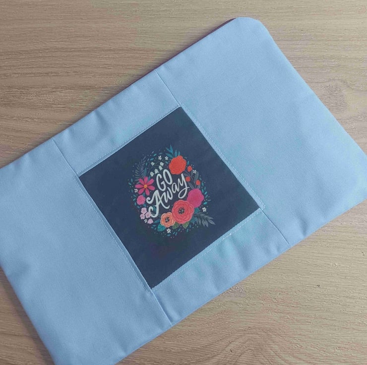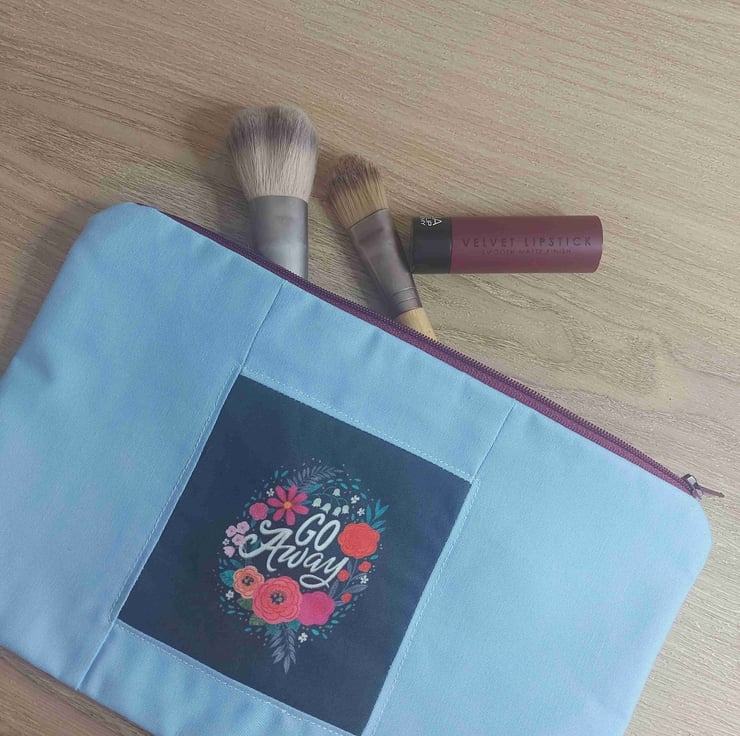 This is a hand made one of a kind make up bag or pencil case users choice , in a beautiful pale blue cotton . The lining is a rainbo print . The real feature of this range is the panel on the centre front of the bag this one reads '' go away '' surrounded by wild flowers . This hole collection is a little bit cheeky but all beautifully don there are no repeats in this collection so every bag is a one off they are all also roughly 10 by 6 inches with a 9 inch zip .
