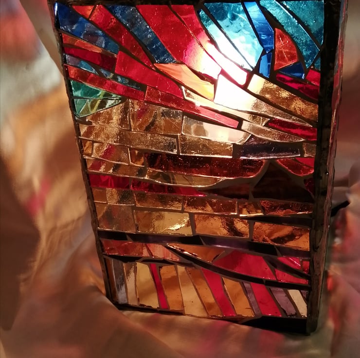This colourful translucent lamp makes a beautiful display piece as a small sculpture when illuminated with natural light as well as becoming a beautiful lamp after dark. It is sized 25 x 15 x 15 approx. cm and comes with a 2m electric lead with switch.