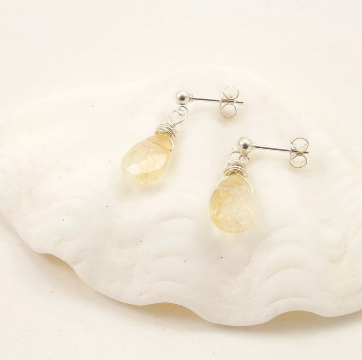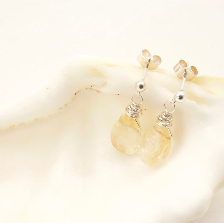 Gorgeous citrine faceted briolettes have been wire wrapped with sterling silver wire to create a bead cap and bail and are displayed on sterling silver stud ear wires.
