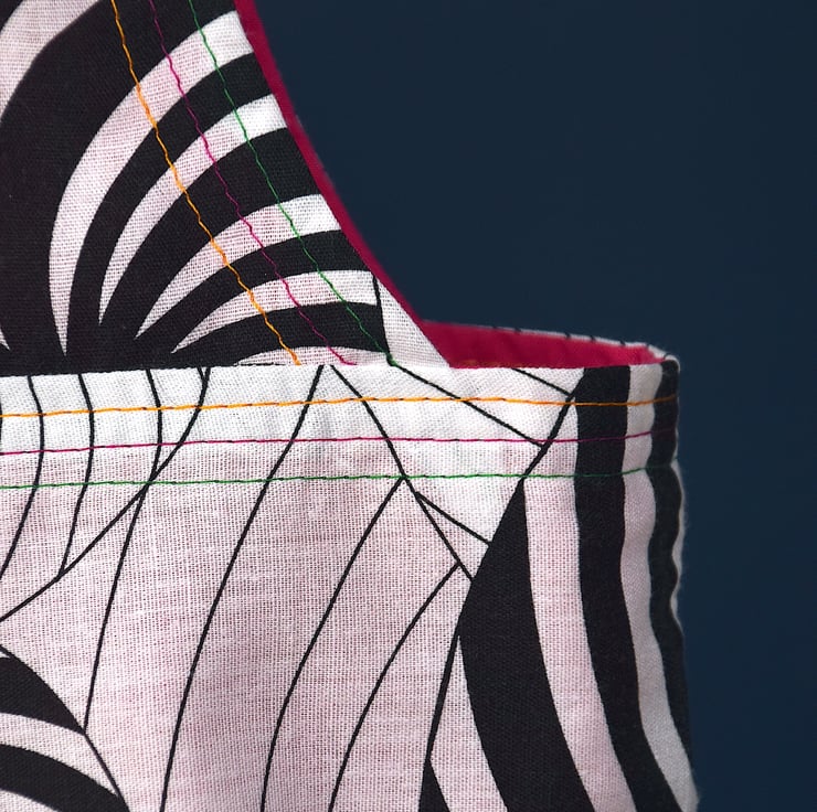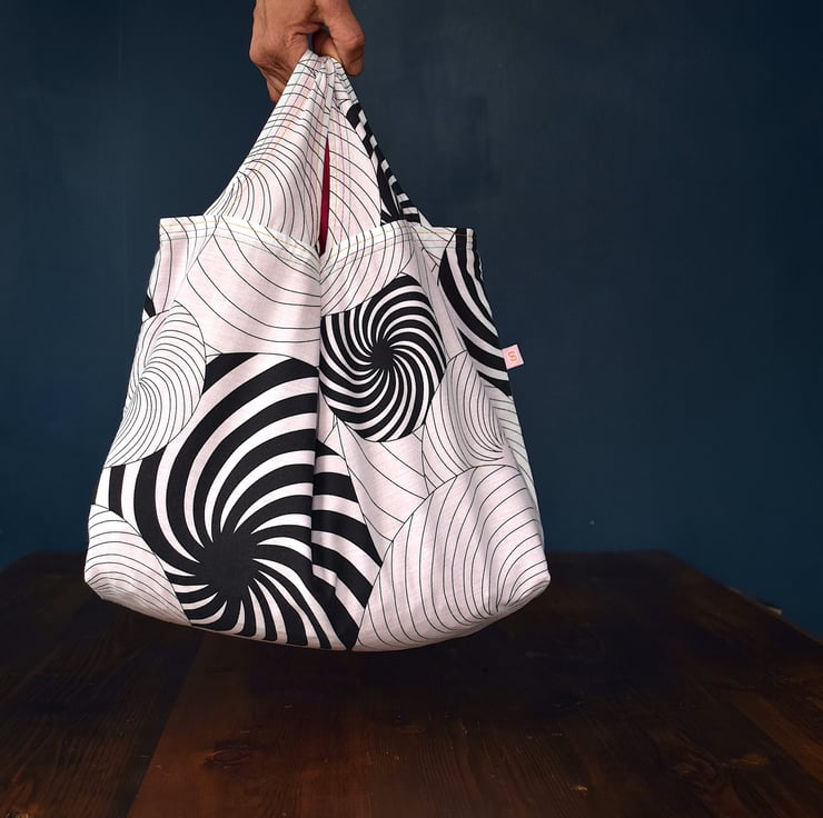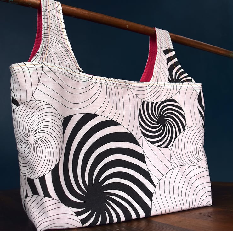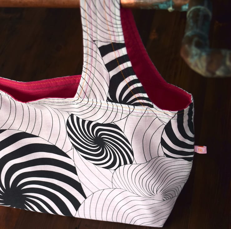 One-off luxury grocery shopping bag. Each bag is made with a unique combination of repurposed fabrics. This striking combo has a bold black and white psychedelic swirl exterior with a bright cerise interior. Yellow, pink and green top stitching complements the colours of the fabrics and adds bright accents.