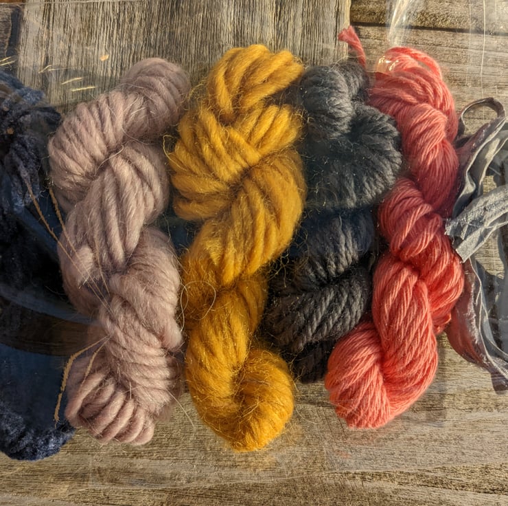 Various yarns and fibres in lovely colour combinations, to create the weft, which include a mixture of materials from the following