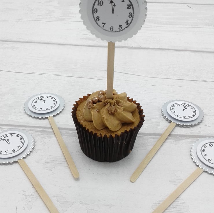 This listing is for a set of 20 silver and white cupcake toppers decorated with a clock face approaching midnight.