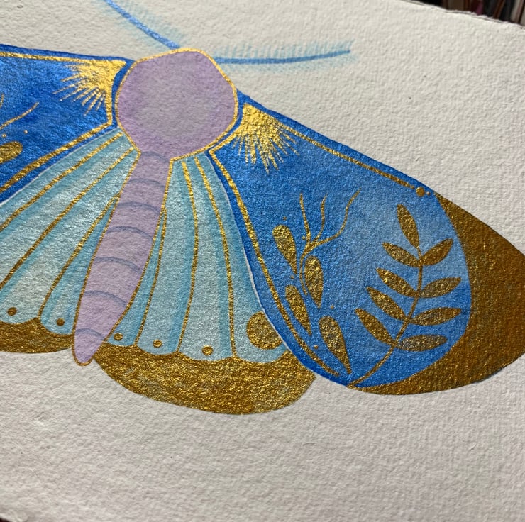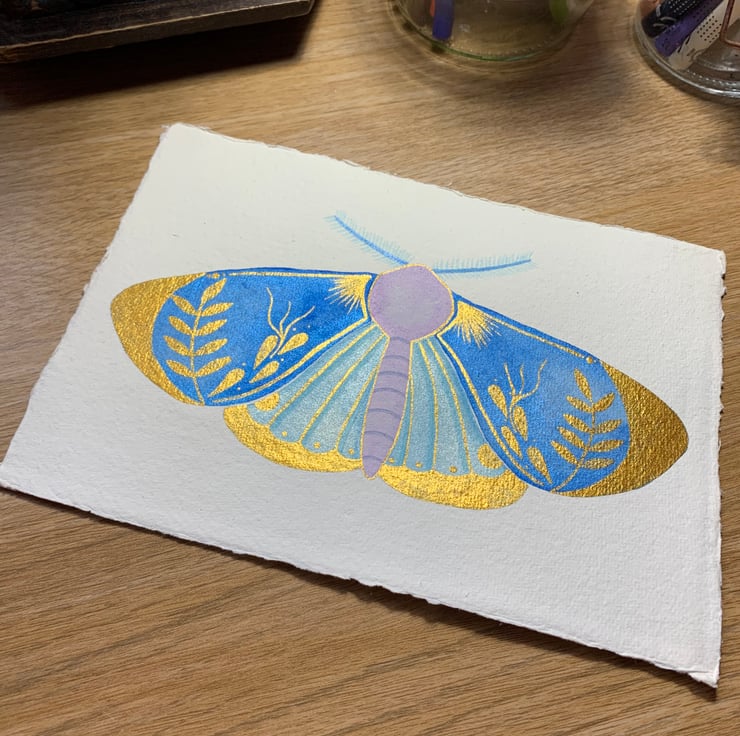 This piece has been painted with watercolour paints and watercolour gold paint for the details.