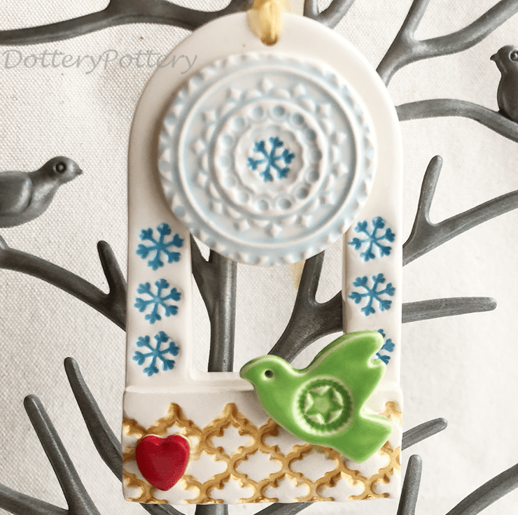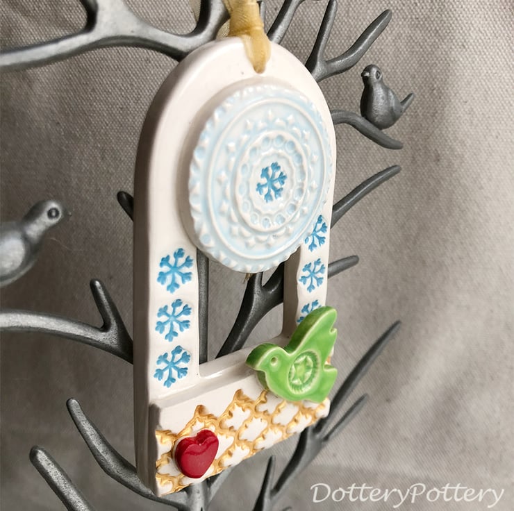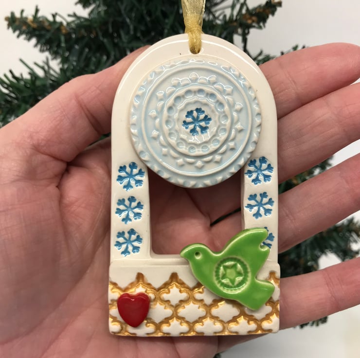 This large decoration features a bird and snowflakes. It has a gold metallic feature along the bottom. It has been fired twice and finished with rich, glossy glazes. Glazed on the front only. It measures 9cm x 5cm x 1cm deep and hangs from a gold coloured organza ribbon.
