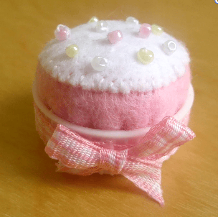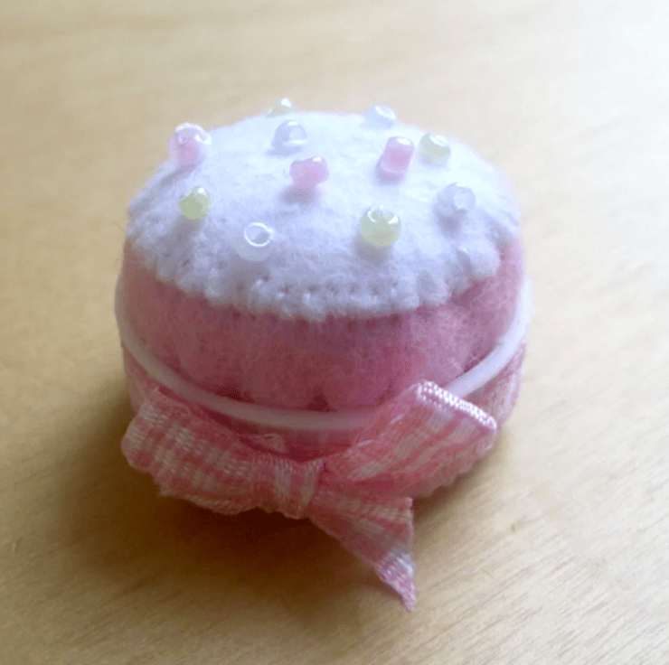 Cute tiny handcrafted cupcake, created from pink/white felt, handstitched bead sprinkles, stuffed with polyester fibrefill.