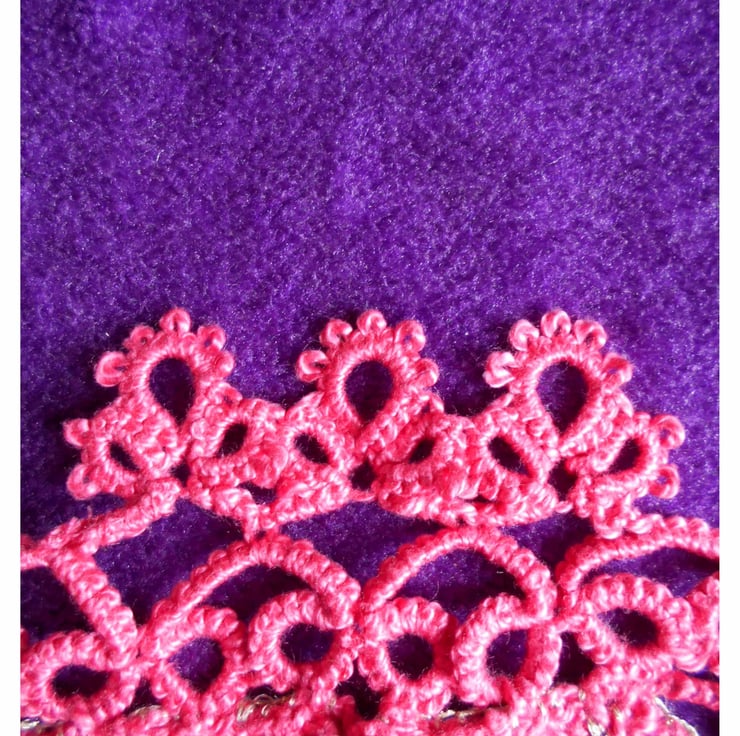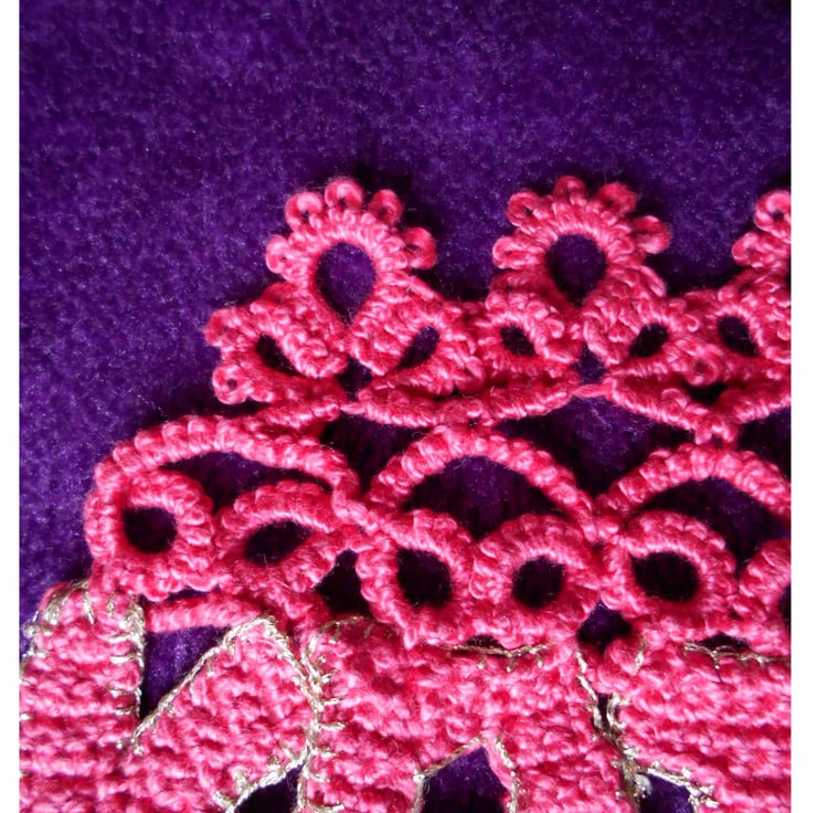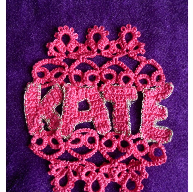 To complete this beautiful textile, I added extra embellishment using the craft of tatting to form a beautiful border for the name.