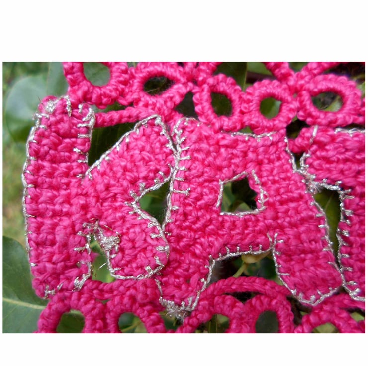 I combined two crafts to make this very special and eyecatching piece. I crocheted each letter, which I then trimmed by hand with gold metallic thread.