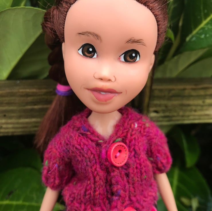 Louise is a hand-painted makeunder doll designed to encourage imaginative play. She was a second-hand Bratz doll who has been given a new lease on life as a unique, age-appropriate Festival folk doll. She has beautiful brown eyes and long red hair.