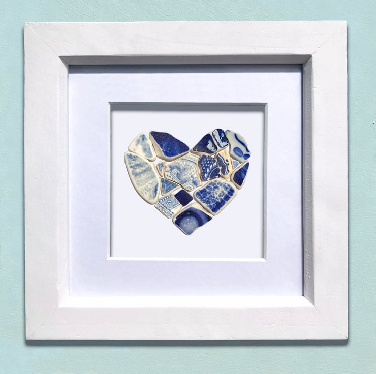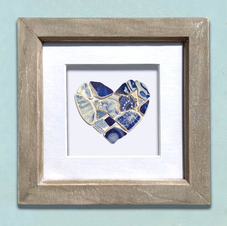 A sea pottery heart picture handmade from beautiful antique blue and white Scottish beach china. These sea-worn ceramic fragments wash up on the beautiful beaches in the East Neuk of Fife in Scotland. Often featuring the famous 'willow' pattern, much of the pottery dates back to the Victorian era, when ceramic factories threw their 'seconds' into the sea and locals used to cast their broken pottery into the waves for good luck! The pottery has been gently worn smooth by the rough Scottish seas but the patterns and colours remain vibrant, a testament to the manufacturing processes of the time.