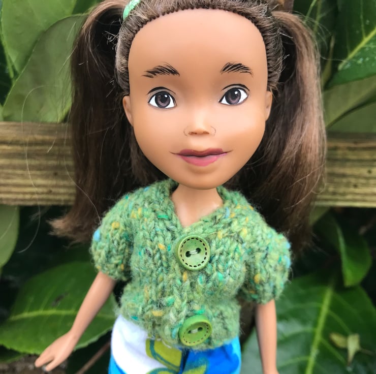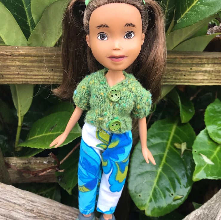 Lisa has enjoyed a thorough spa treatment and had her hair de-tangled, washed and trimmed. She has been cleaned and sterilised. Her face has been repainted by hand in non toxic paints and sealed to give her a fresh, natural look. Lisa has a cute outfit, including a hand knitted top in Rowan tweed yarn and printed trousers. Her shoes are made from polymer clay and pop on and off foot nubs.