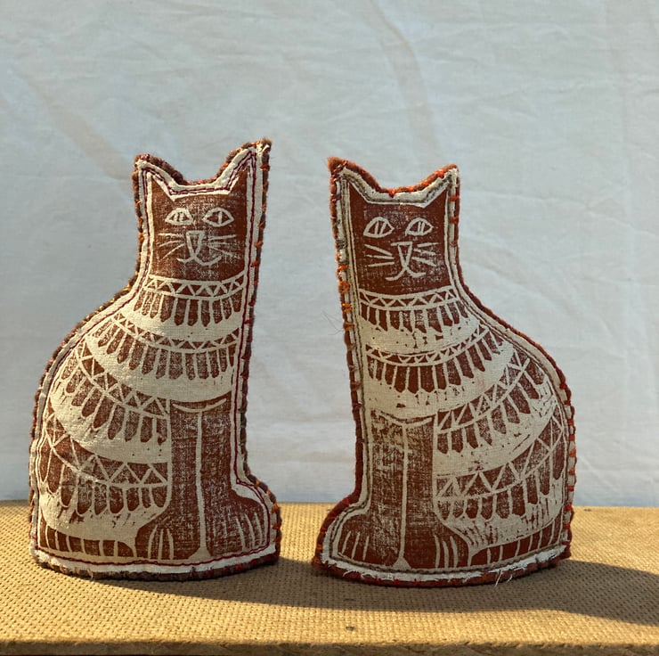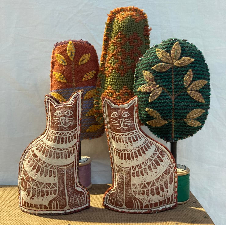Inspired by Enid Mark, Edward Bawden and Staffordshire pottery. I love lino printing and have recently found the best printing inks and way of making these little cats up with. They have a lovely mid-century feel to them and sit very well with my trees (if you don’t think about giant cats and scale of course)