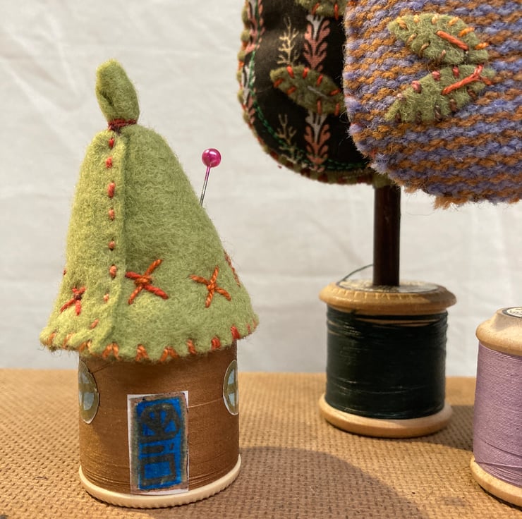 I’ve drawn the doors and windows and decoupaged them onto the thread which is the original colour of the bobbin.