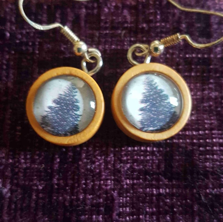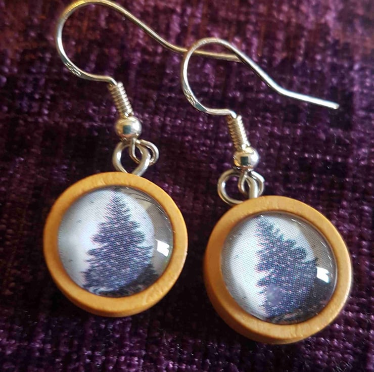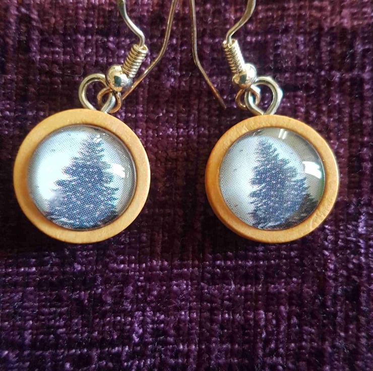 Handmade circular wooden and glass cabochon with tiny Christmas trees, also with 925 silver hooks, lovely as a gift at this time of year.