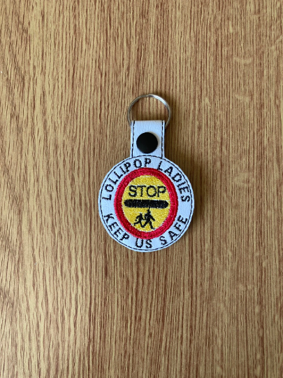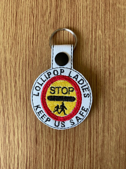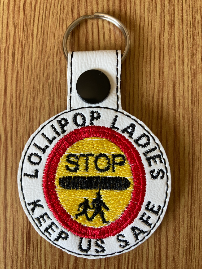 Lollipop ladies keep us safe keyring made from vinyl and backed with felt.