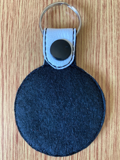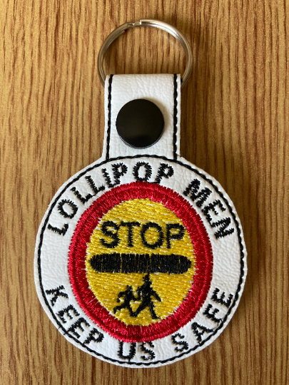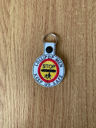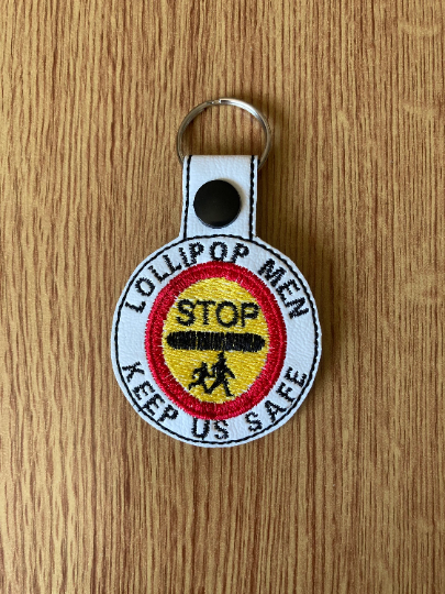 Lollipop men keep us safe keyring made from vinyl and backed with felt.