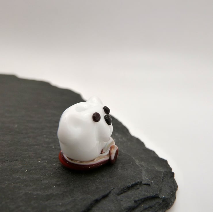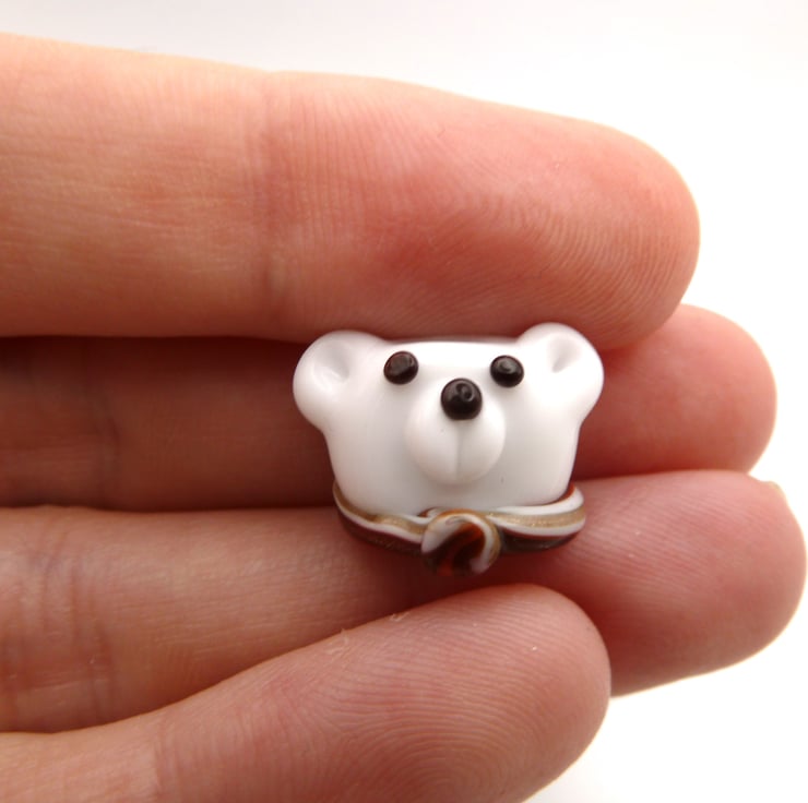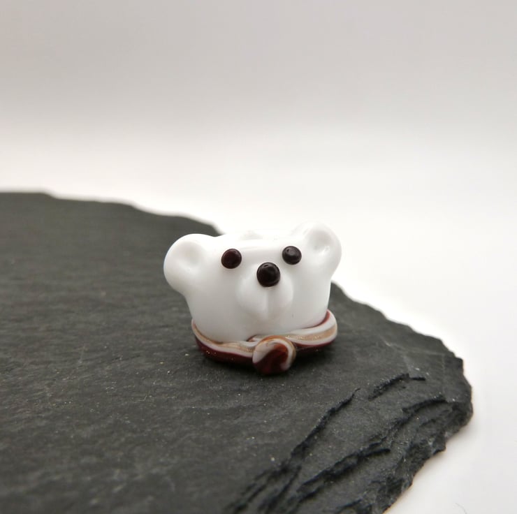 A lampwork glass polar bear bead made with white glass and featuring a red scarf.