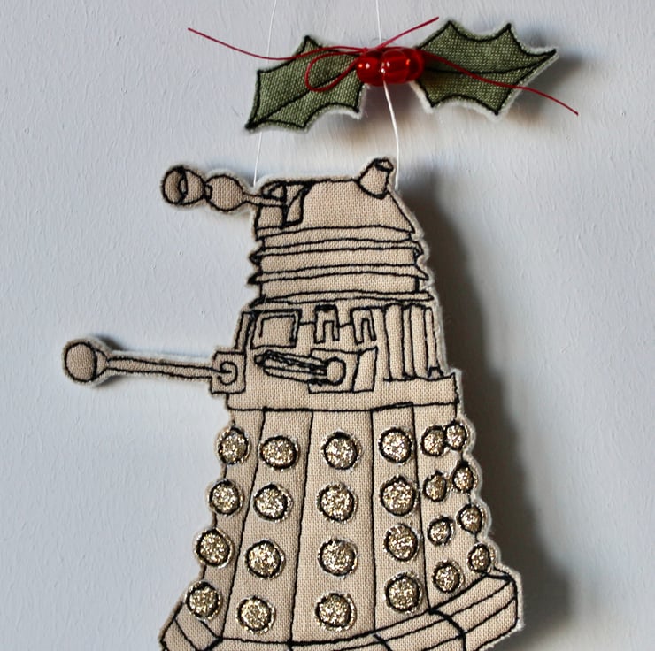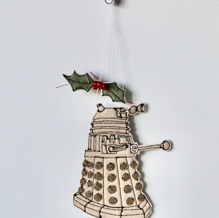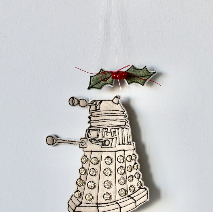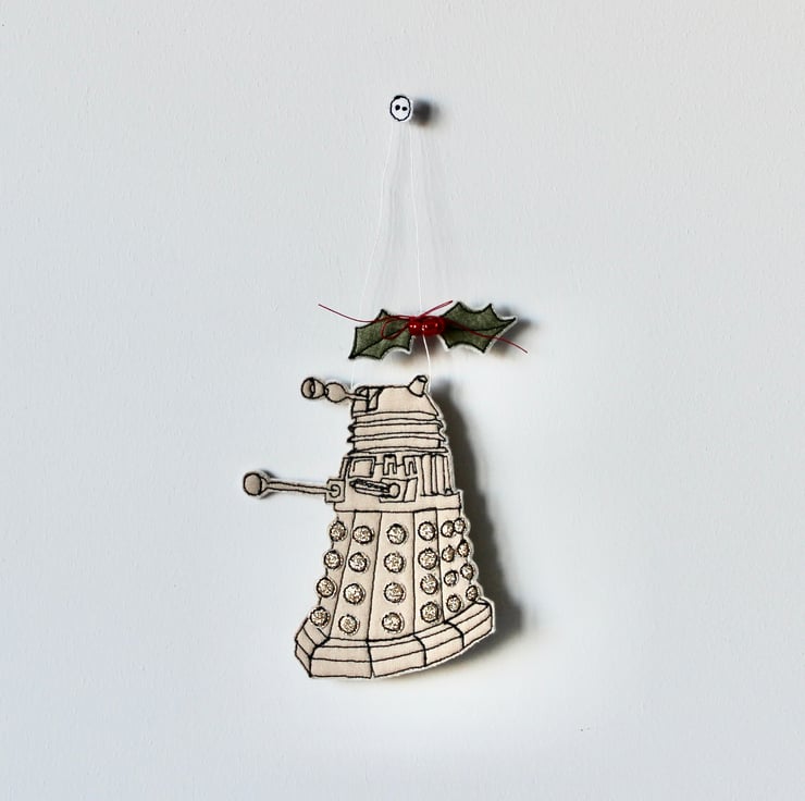 Dalek is created using 100% cream wool felt, cotton cloth, glitter fabric, free hand machine embroidery and cut out by hand using a very sharp pair of scissors. With red glass beads making perfect holly berries and a linen thread to hang.