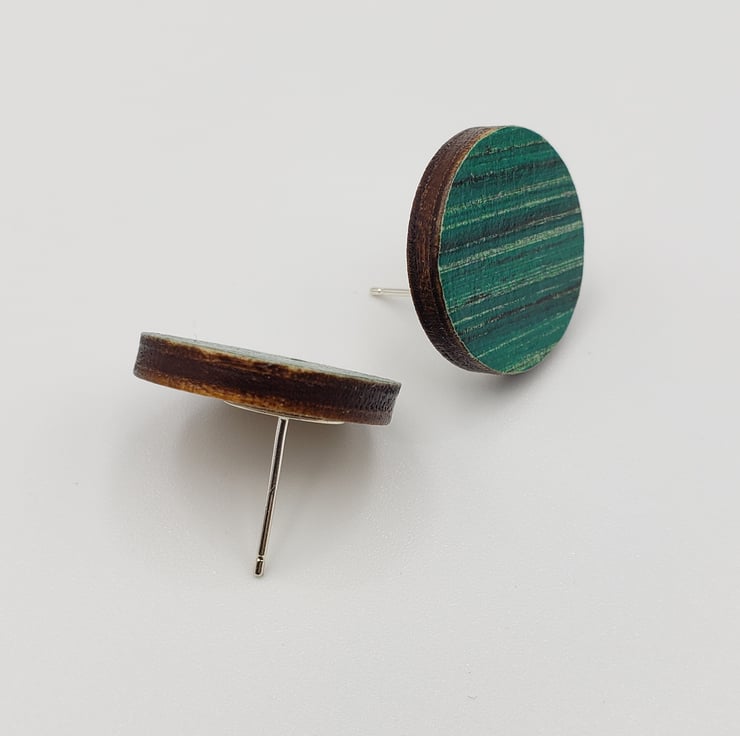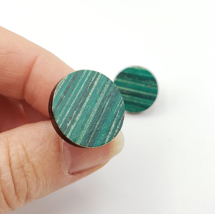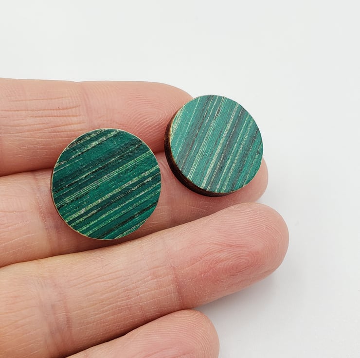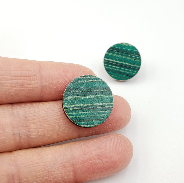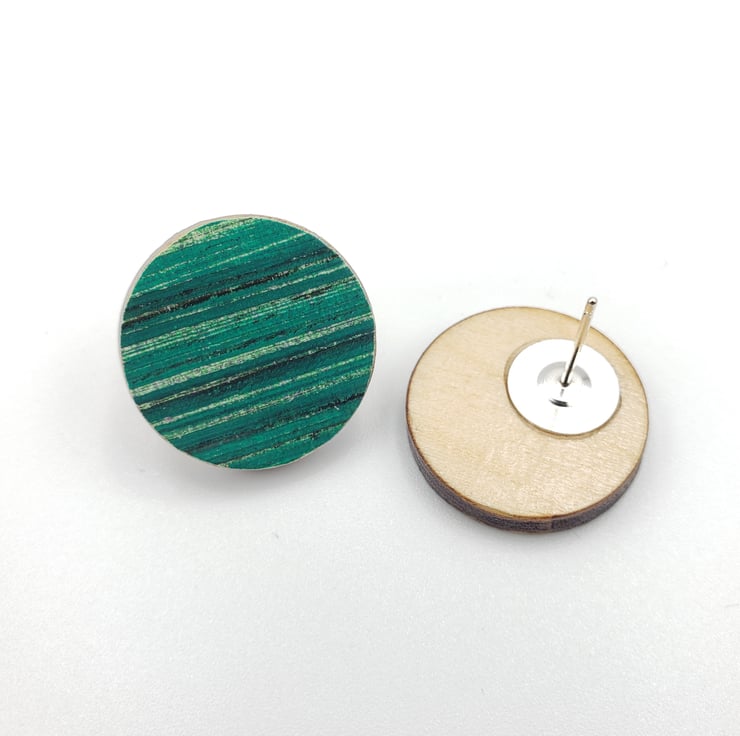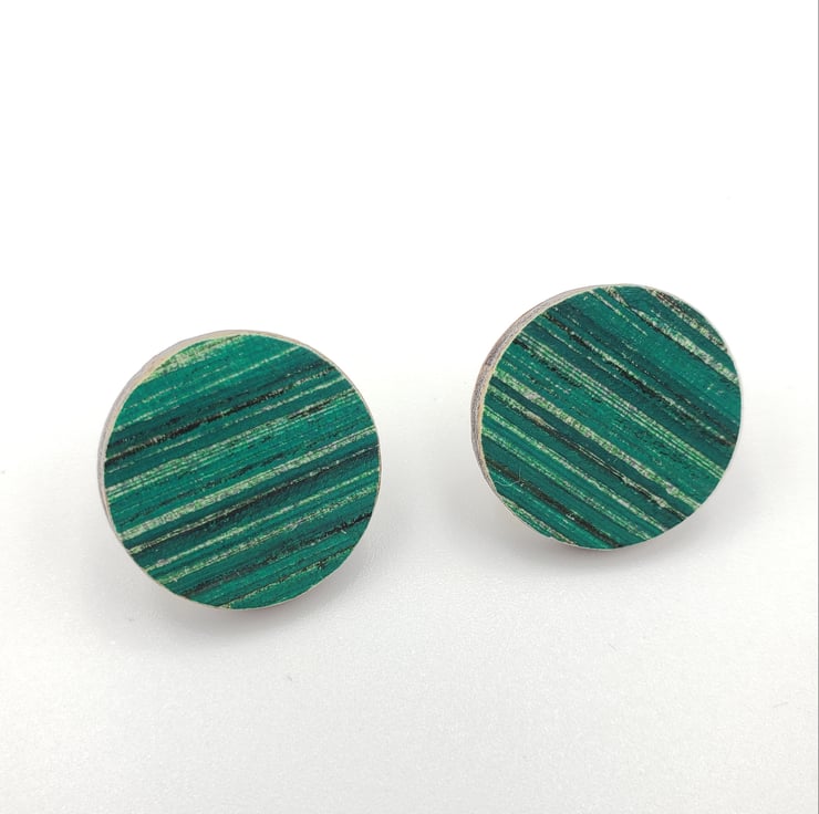 Stripy stud earrings in dark green, light green, black and off white. The pattern is a mixture of narrow and wide lines running horizontally across the earrings. Sweet little everyday earrings which are very light to wear.