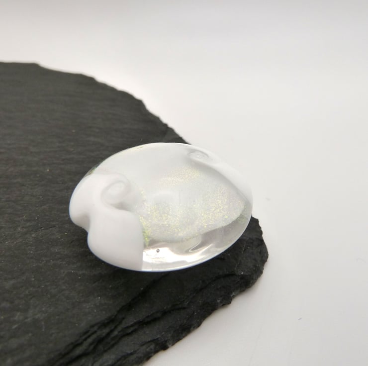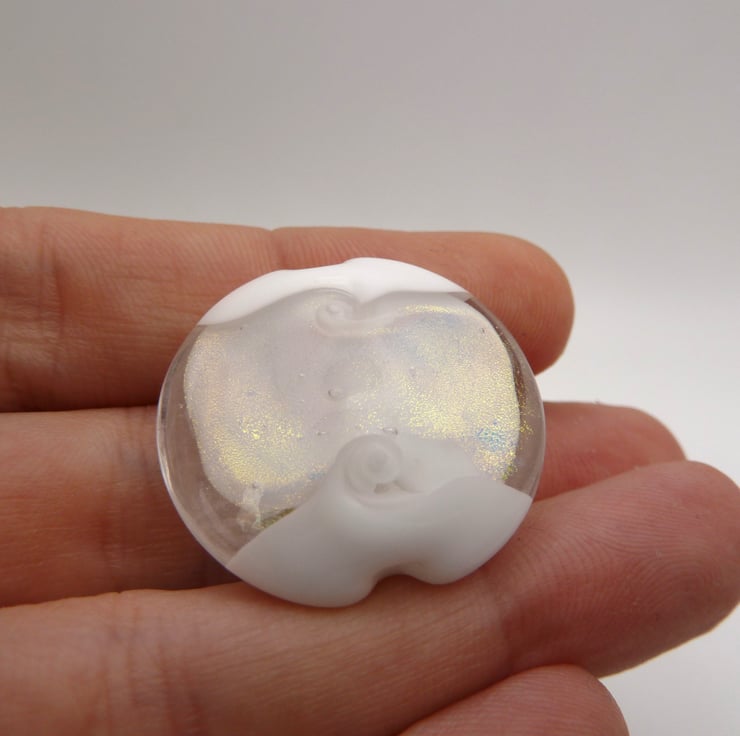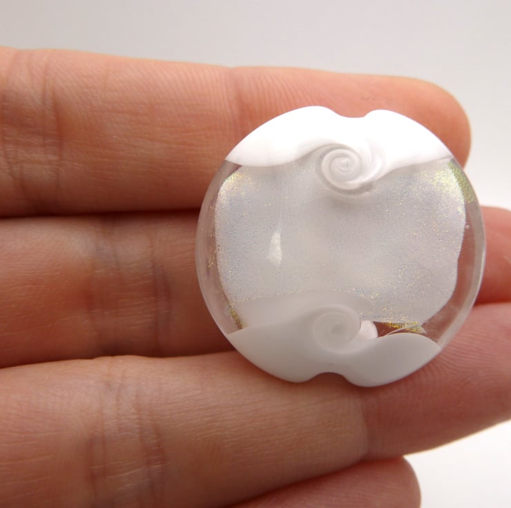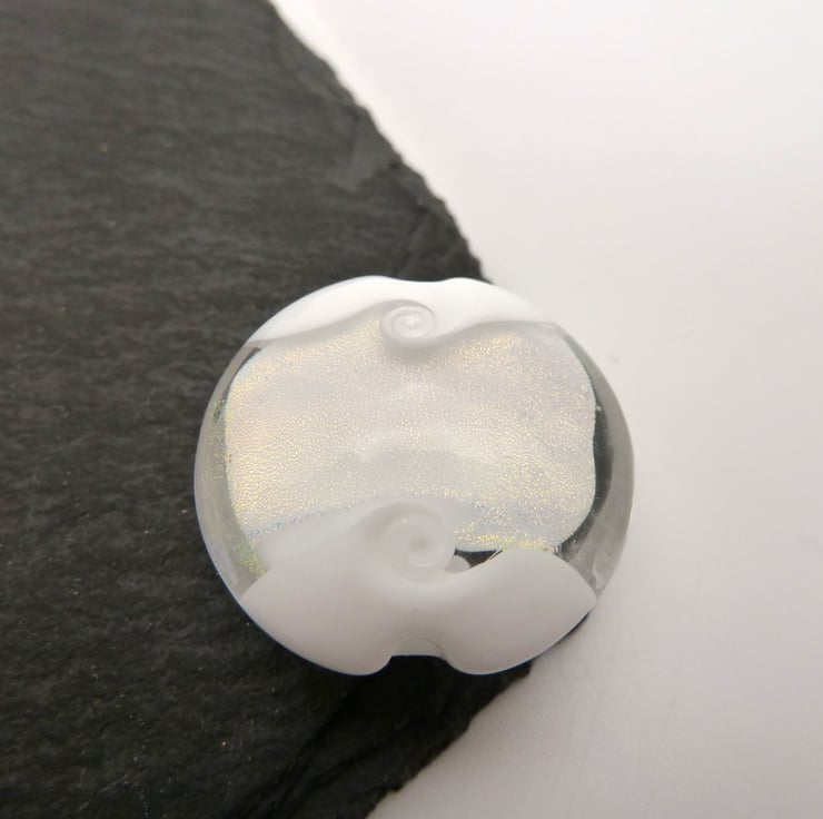 A lampwork glass beads made with white glass and featuring a band of dichroic glass in the middle. The bead has been shaped using a brass press.