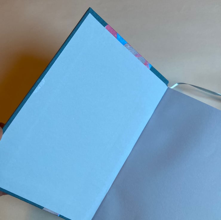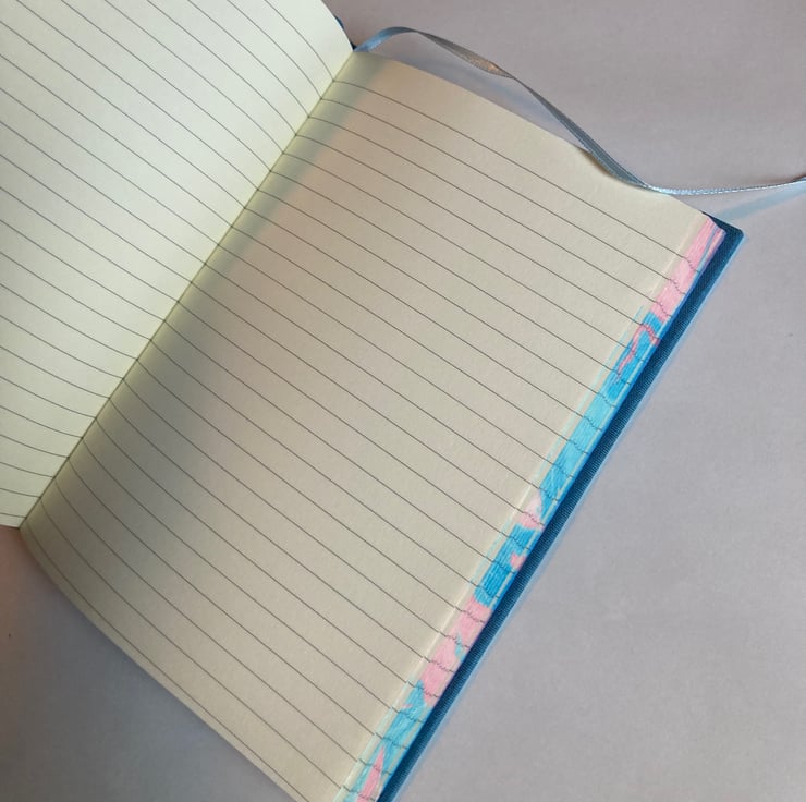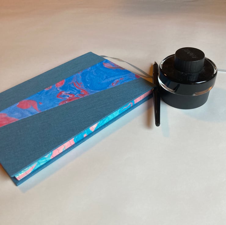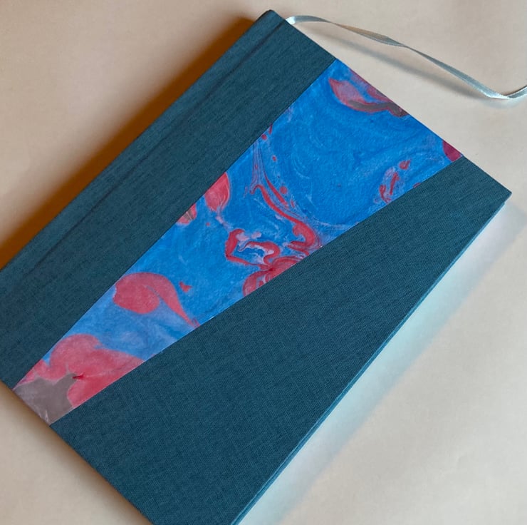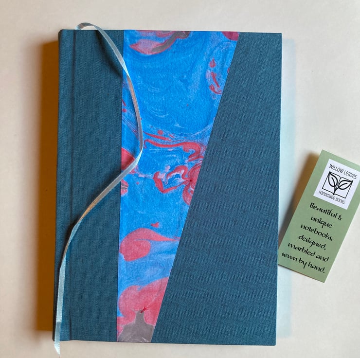 Made by hand at every stage, as all Willow Leaves books are, this lovely piece is covered in hand-marbled paper in vibrant blues and pinks and bound with soft-blue book cloth. I decided to marble the edges of the pages too! It is filled with cream lined paper and so it would make a great journal or the perfect gift for a writer or poet. It is A5 size (measuring 15 c 21 x 1.5 cm) and can fit into a bag or a spacious pocket.