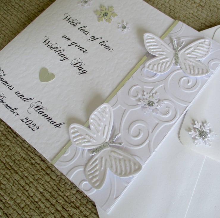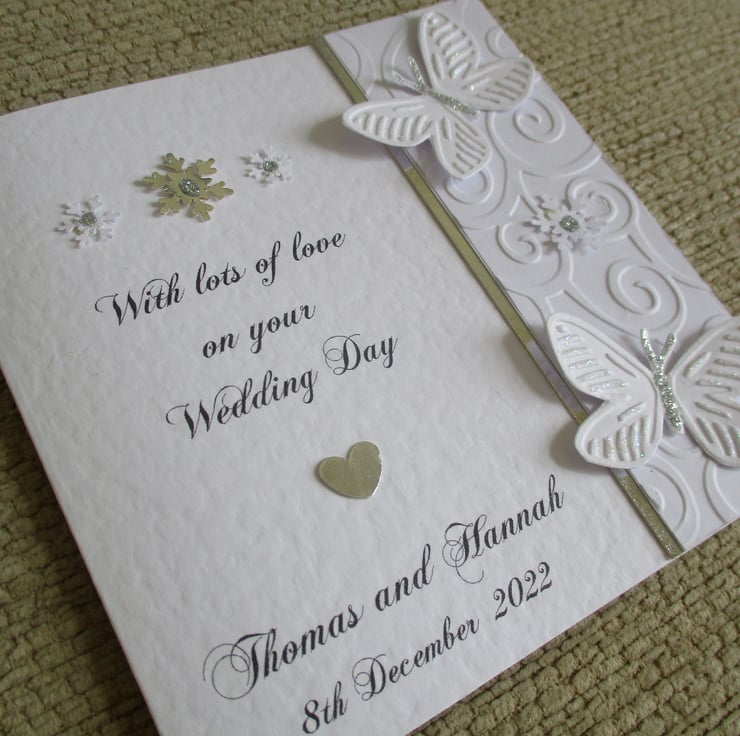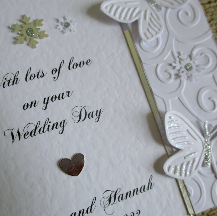 Printed with the text "With lots of love on your Wedding Day" and your own personalisation, with a small metallic silver heart in between and 3 snowflakes at the top in silver and white with silver glitter.