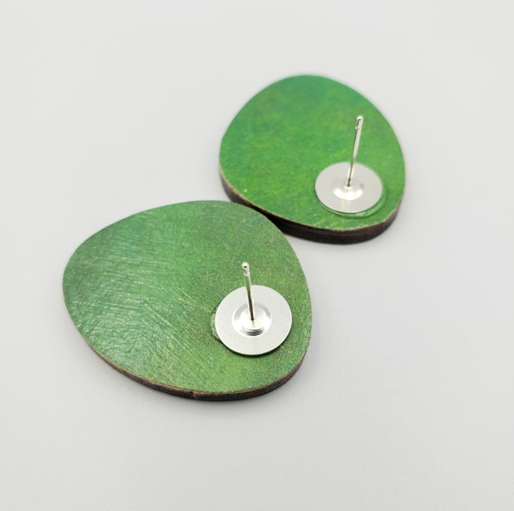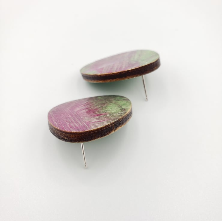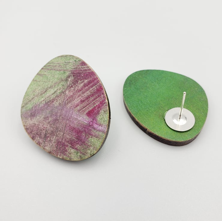 Hot pink and light green pebble shaped earrings with Sterling silver backs. Lovely unusual shaped studs with a random scribble design in a hot pink and light green colouring. The back is in a plain green print (see photos).