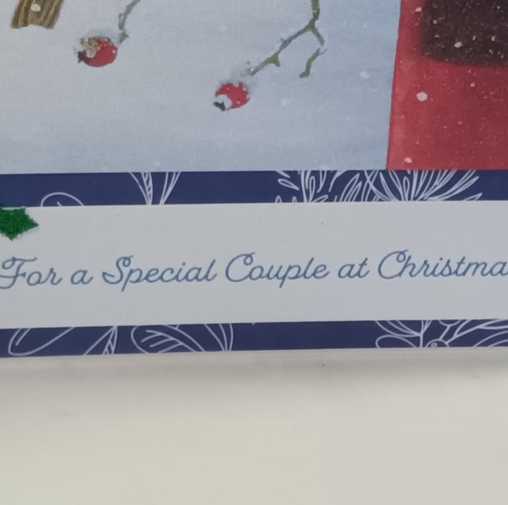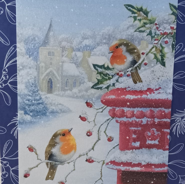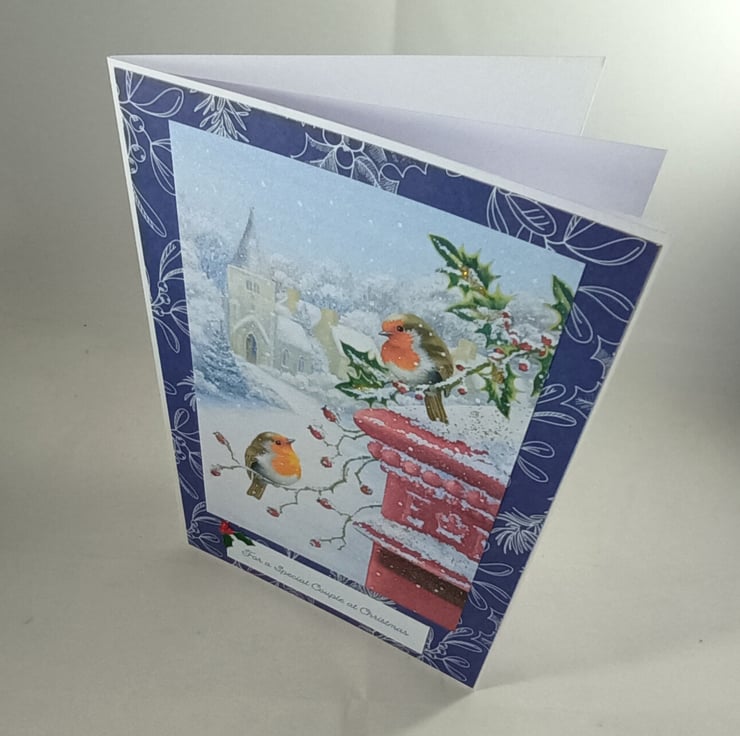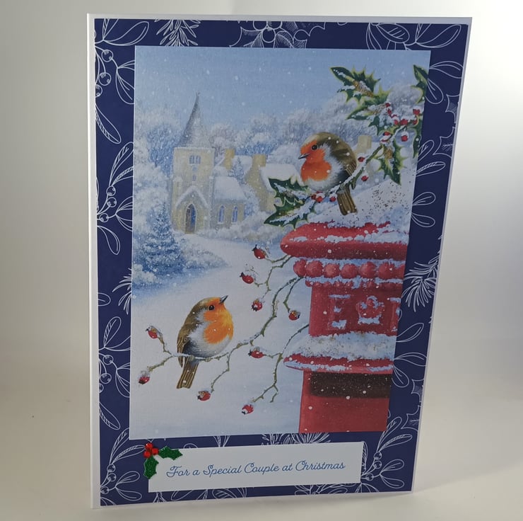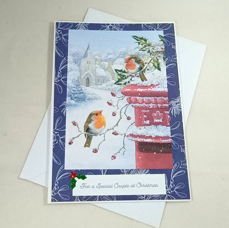 Handmade Christmas card featuring a pair of cute robins sitting on holly branches near a post box, with a village scene in the background. The image has been mounted onto a dark blue and white patterned paper of holly and mistletoe. The sentiment reads: 'For a Special Couple at Christmas' and has a small glittered holly embellishment. The snow has been glittered for a bit of extra Christmas sparkle.