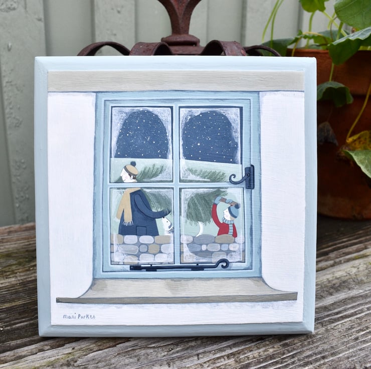 There is a keyhole on the back ready for hanging or the painting can be placed on a shelf or propped against a wall.