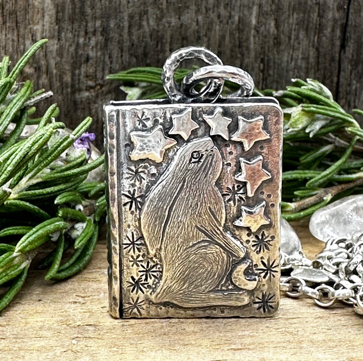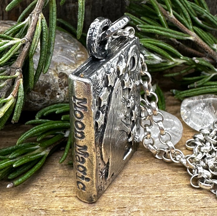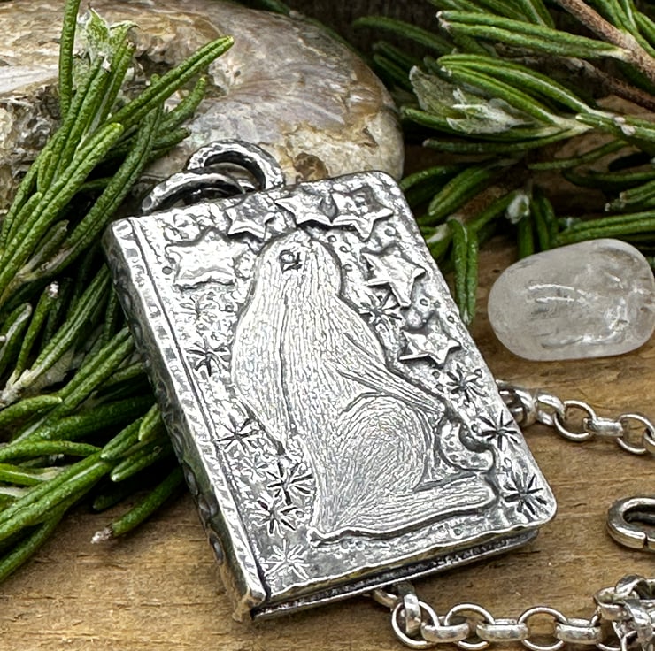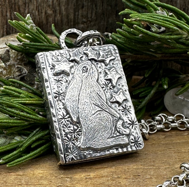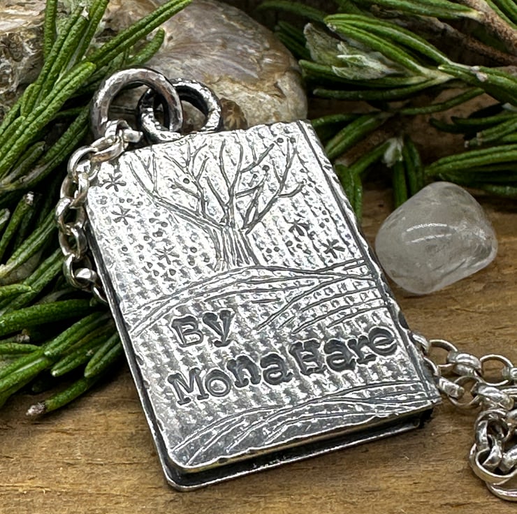 Made using traditional jewellery making techniques; piercing out shapes with my jewellers saw, hand engraving, metal stamping, soldering, filing, polishing - this book pendant has an oxidised finish.