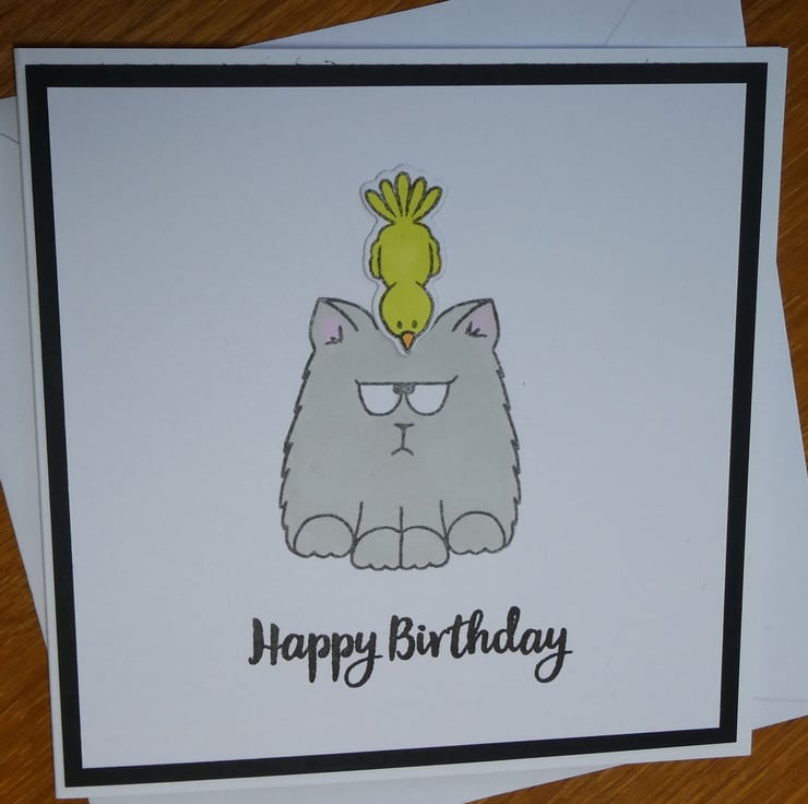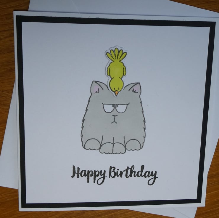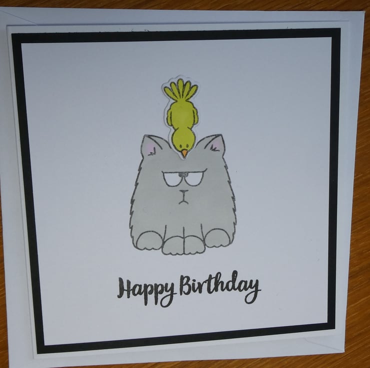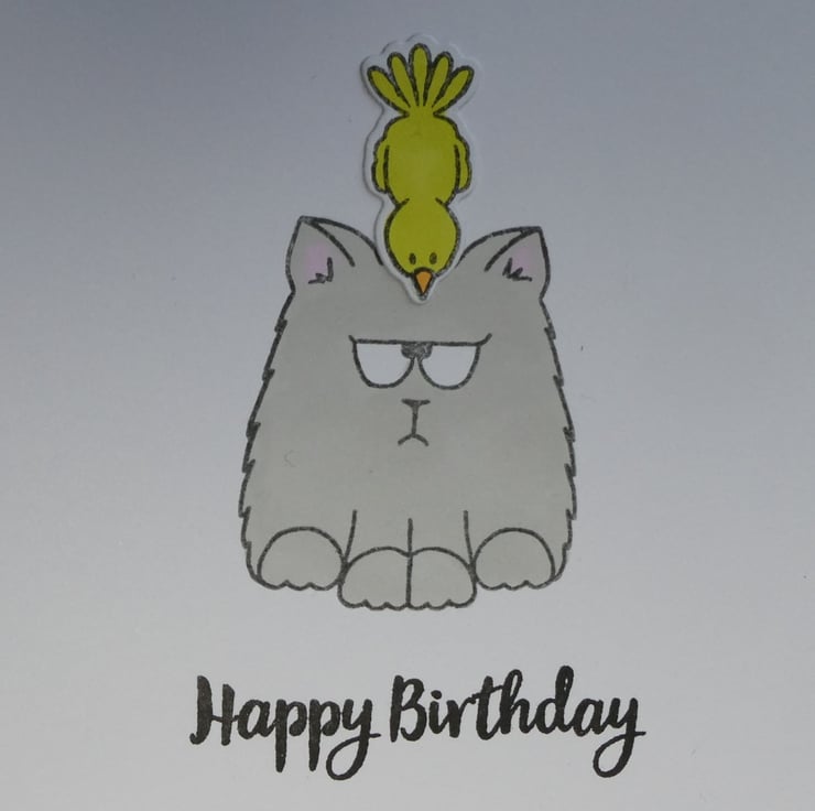 This cute Birthday card has been hand stamped with a grumpy looking grey cat with a bright green bird sitting on his head.