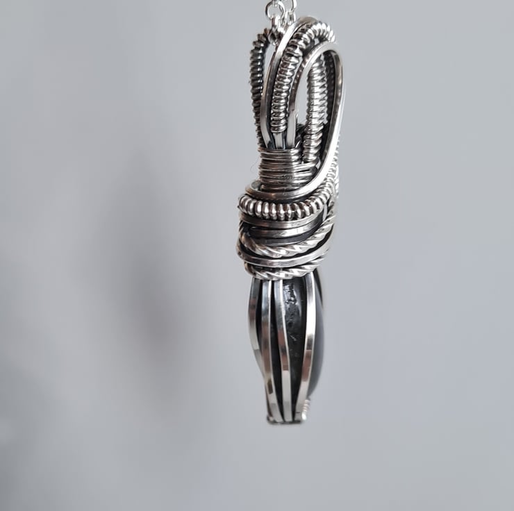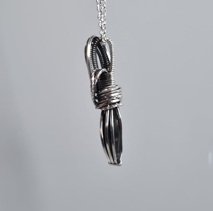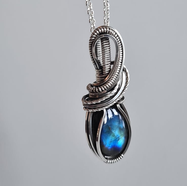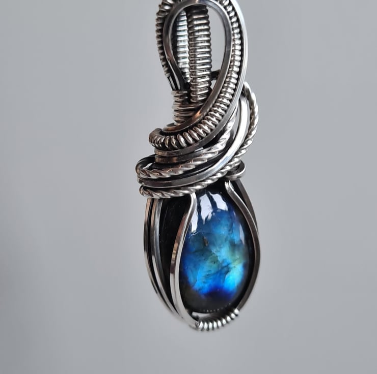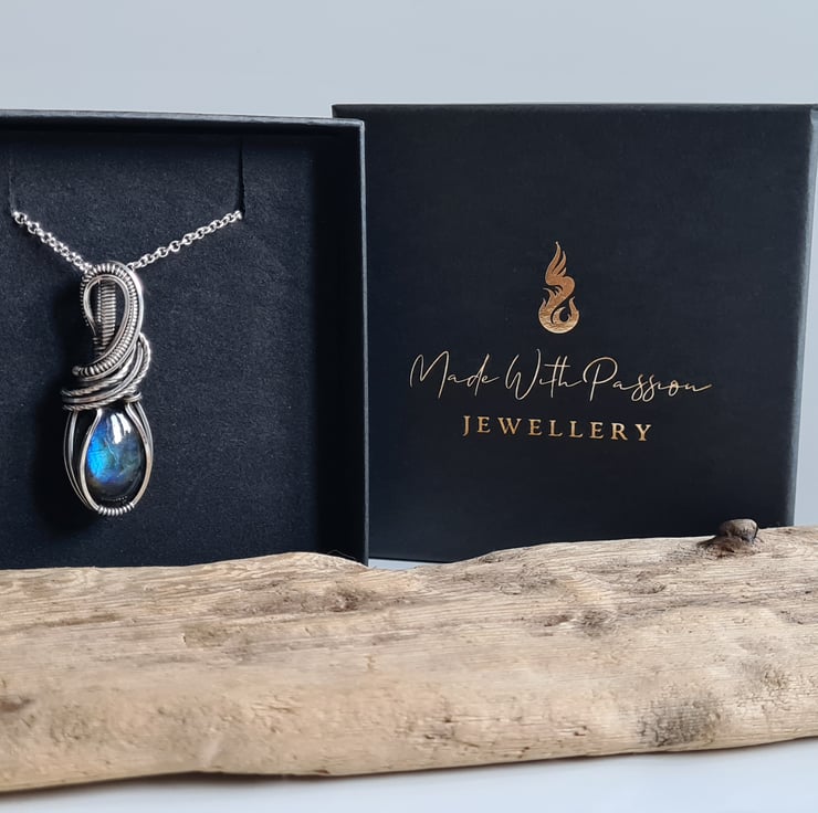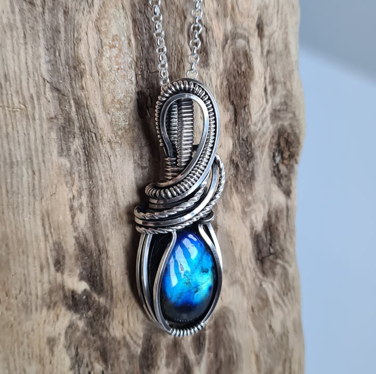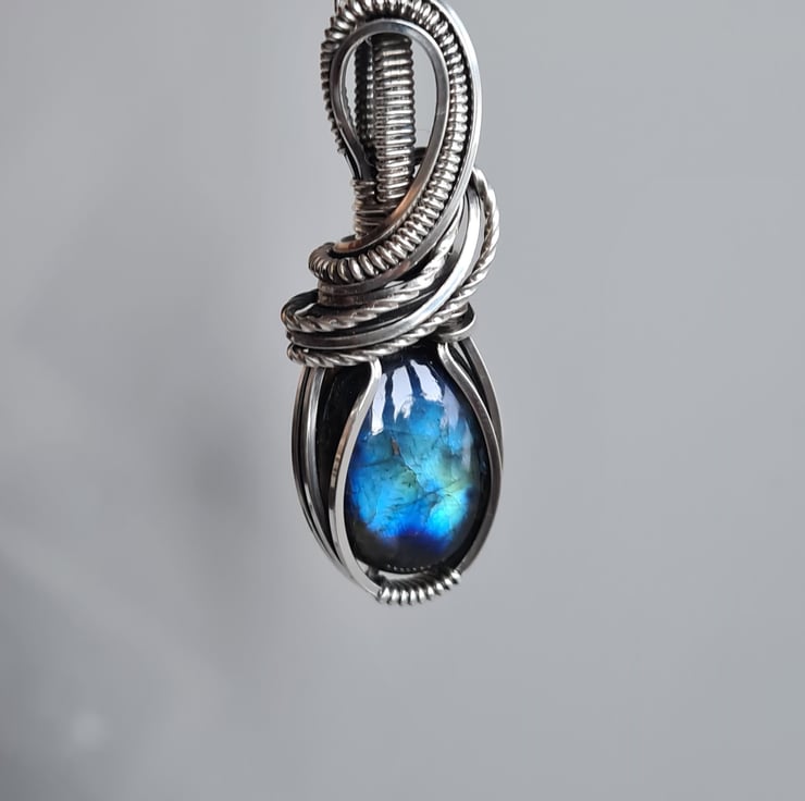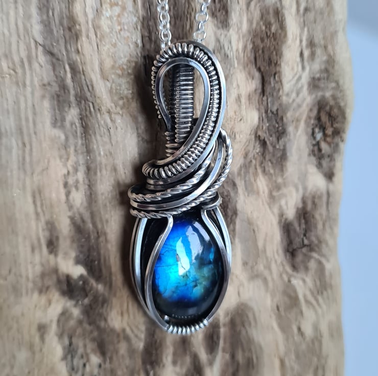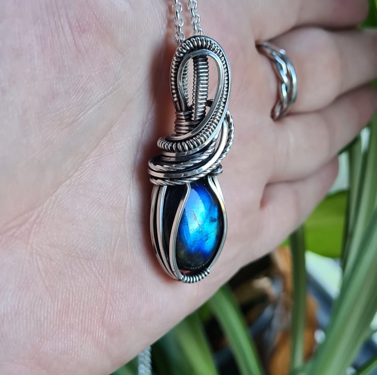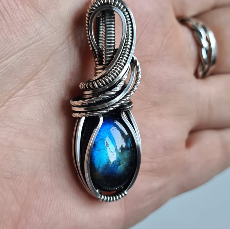 I have taken this really beautiful, deep blue Natural Labradorite and hand wrapped it in 925 Silver into this unique design. I have then antiqued and polished the silver for the final effect. This stunning stone has such a deep dark blue shimmer and shine, and videos of the pendant can be viewed on my Facebook & Instagram profiles.