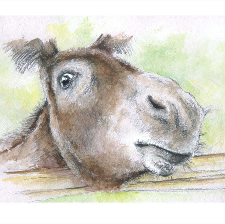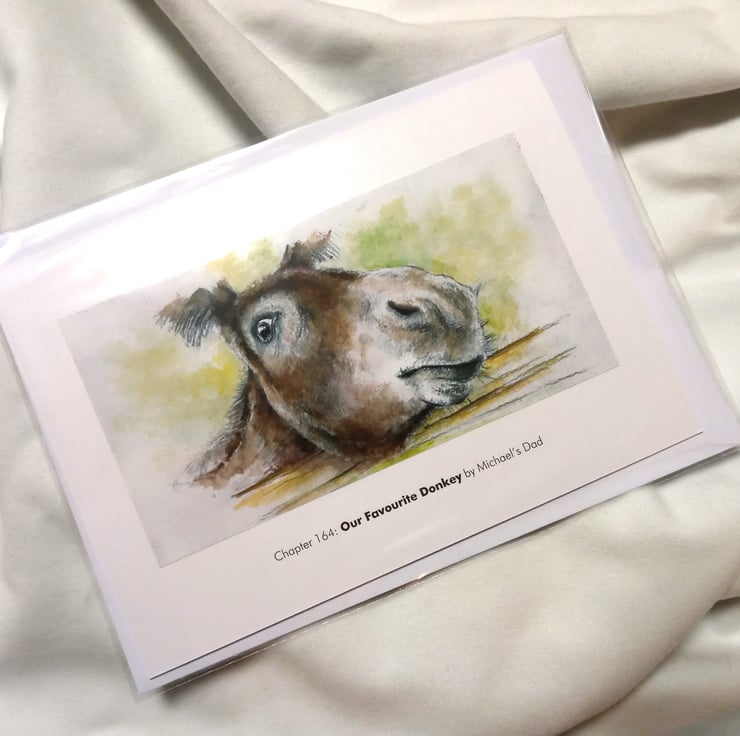 An original hand painted watercolour print of a Sussex southdowns Donkeyt printed Greeting Card, taken from the illustrated book 'I am Michael Glare and this is my Life', with 400 watercolour prints just like this. 'Every watercolour has a story.' Card size 9" x 6" inside blank for writing on with a plain white envelope.