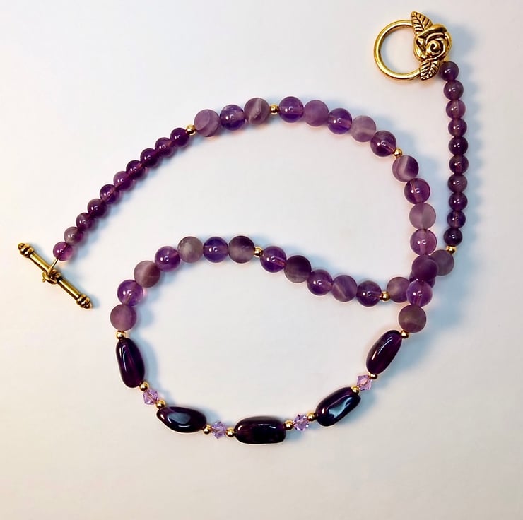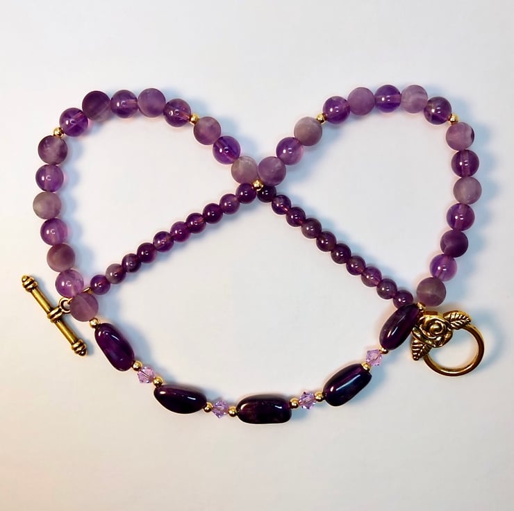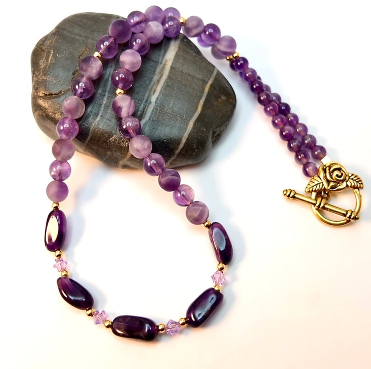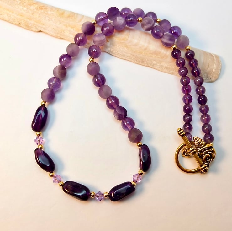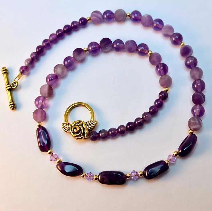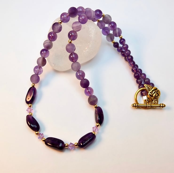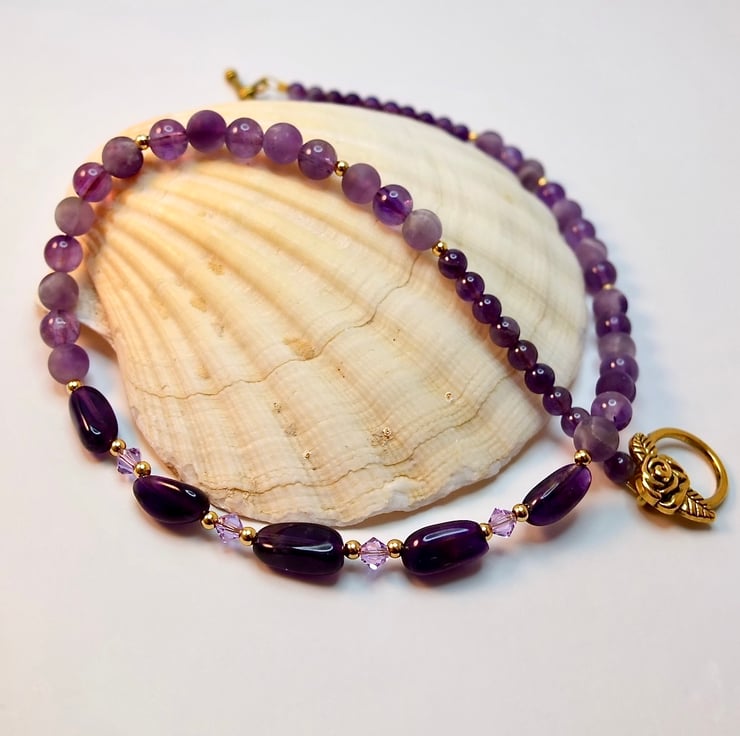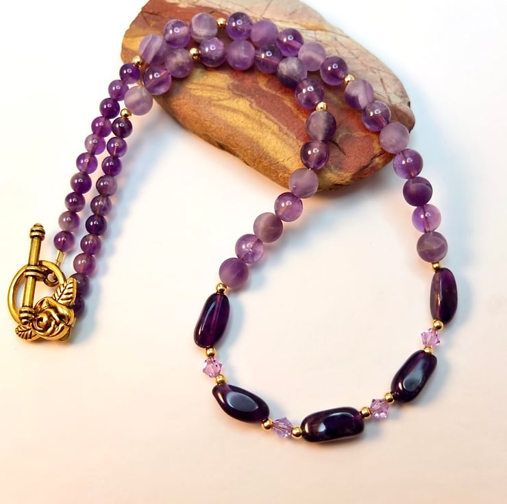 Gorgeous necklace of purple amethyst with 'violet' Swarovski crystal bicones and tiny gold vermeil spacer beads.