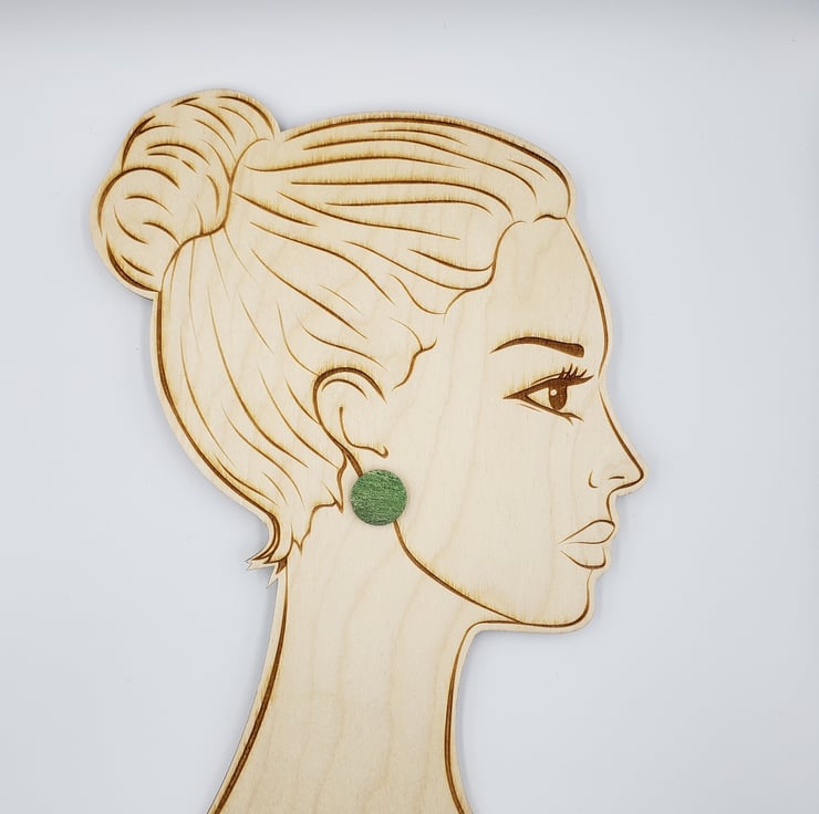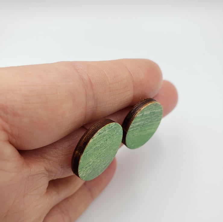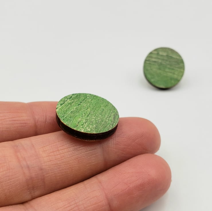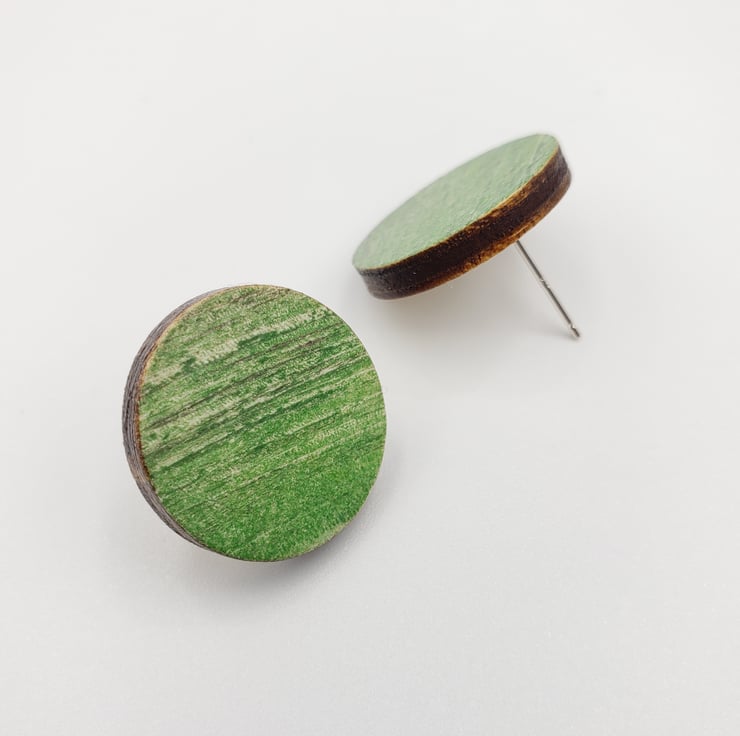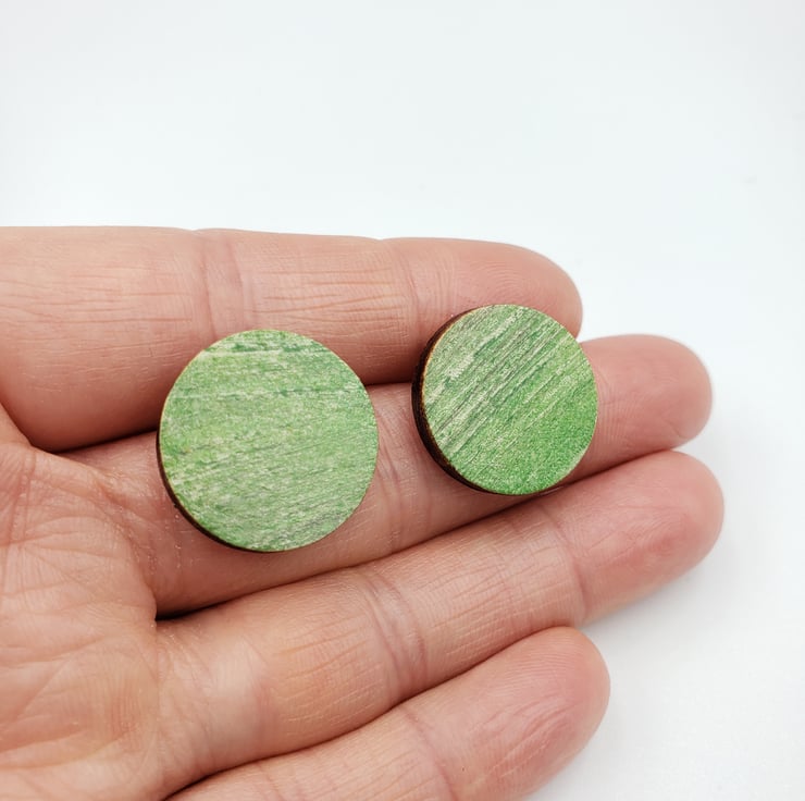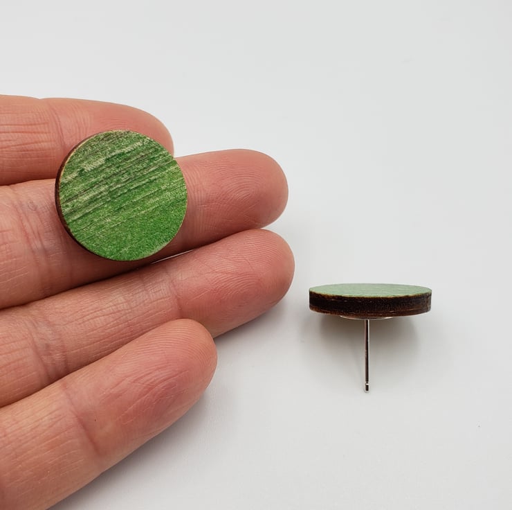 Light green stud earrings with white, dark brown and darker green lines running through, the pattern is very delicate and simple, similar to wood grain. These are double the size of my small round studs and have Sterling silver backs.