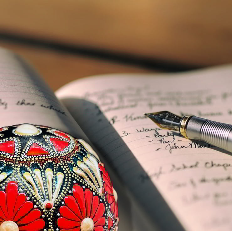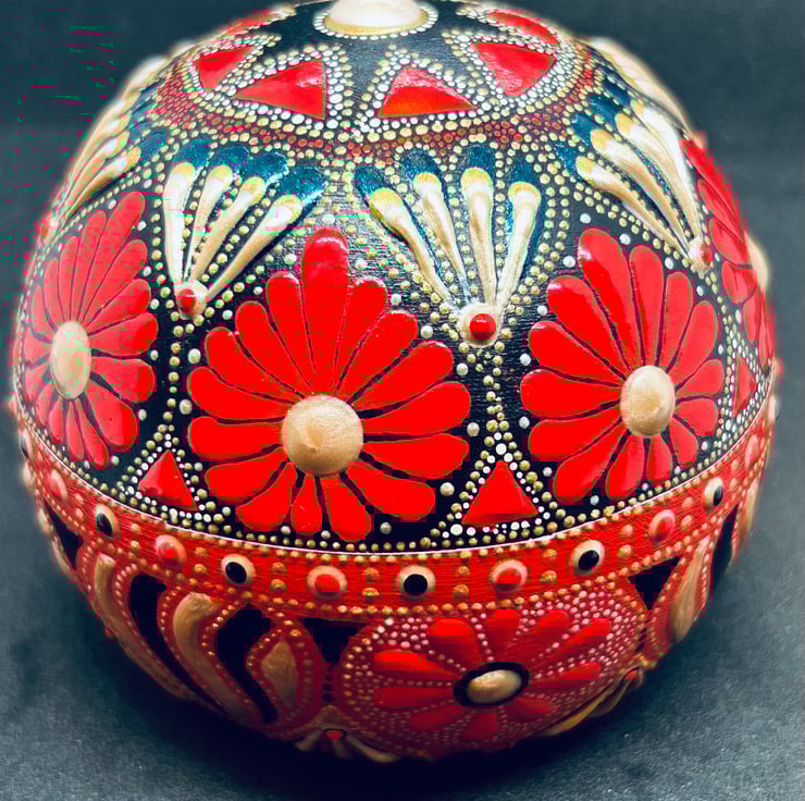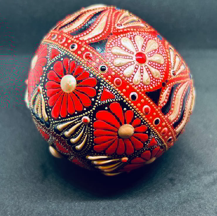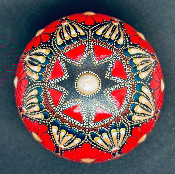 Hand cast from robust plaster and painted in Mandala style, this unique one of a kind weighty sphere in true red and gold makes a stunning paperweight or can be gazed upon as a decorative item or an aid to meditation, the strong and rich colours exude warmth and energy.