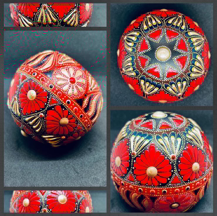 A long slow labour of love resulted in this handsome paperweight - I was drawn to the colour scheme of Red & Gold and had no plan as to what to design … the pattern took on a life of its own, over a period of several weeks and finally the ball is complete.