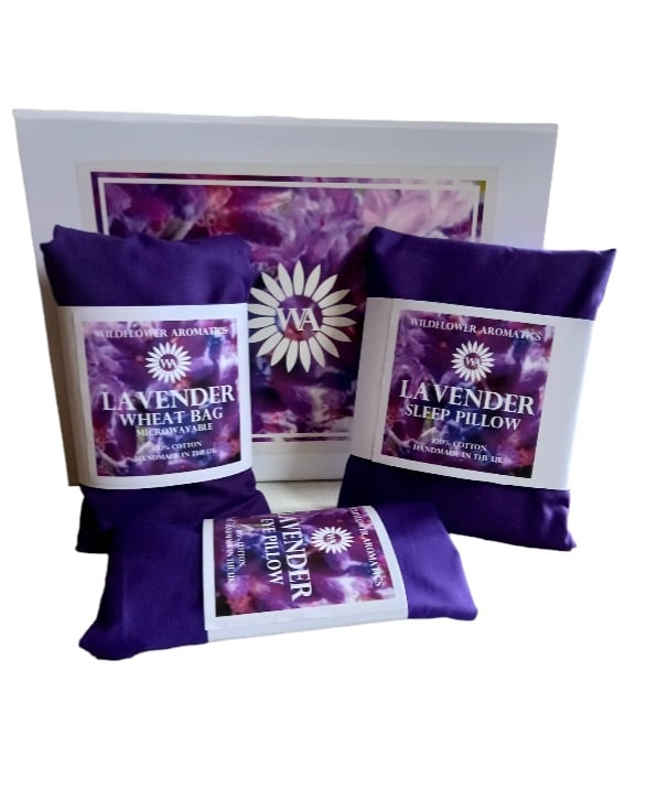 Lavender gift set, wheat bag, sleep sachet and eye pillow all wrapped in a white gift box and tissue paper.