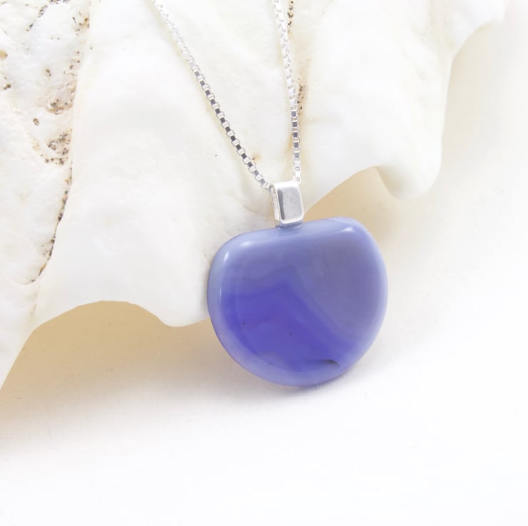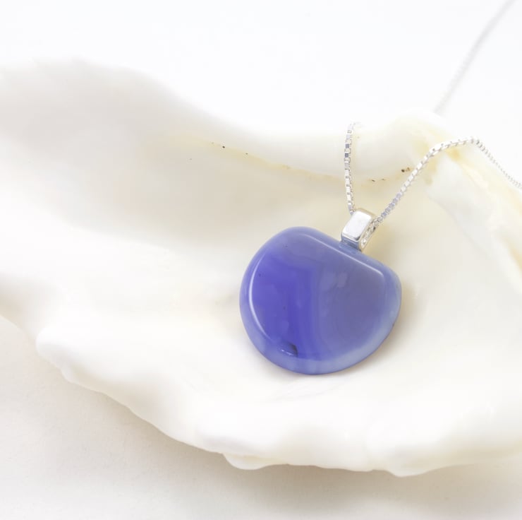 I purchased this unusual stone from a jewellery supplier in Turkey. The soft curved shape and smooth polished surface make it very tactile and it has some interesting patterns within, in various shades of blue. I have let the stone speak for itself in this design and mounted it on a sterling silver drop bail to show off it's beauty.